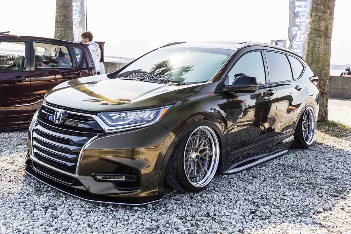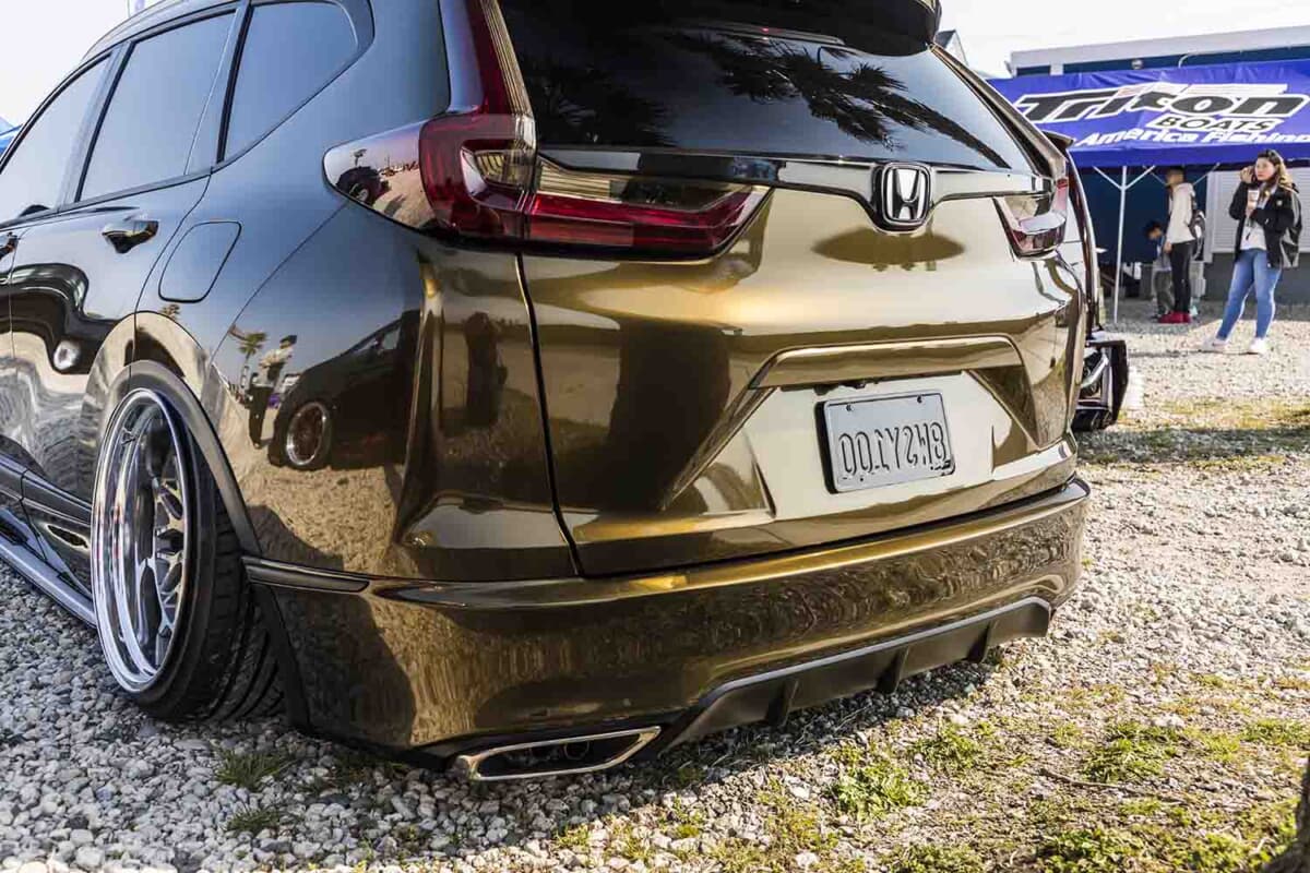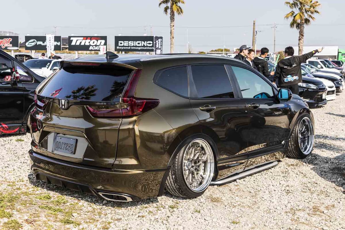 パームツリーがそびえ立つ湖畔のイベント会場はまるでアメリカのよう。そんな会場で開催されたHotspringsで車種不明の1台を発見。オーナーの芳賀さんにお話を伺うと、ベース車は2019年式のホンダ「CR-V」とのこと。いわれてもあまりピンとこないのだが、それも当然。ノーマル車と比較してみると、フロントまわりはヘッドライトから下がまったくの別モノとなっているのだ。