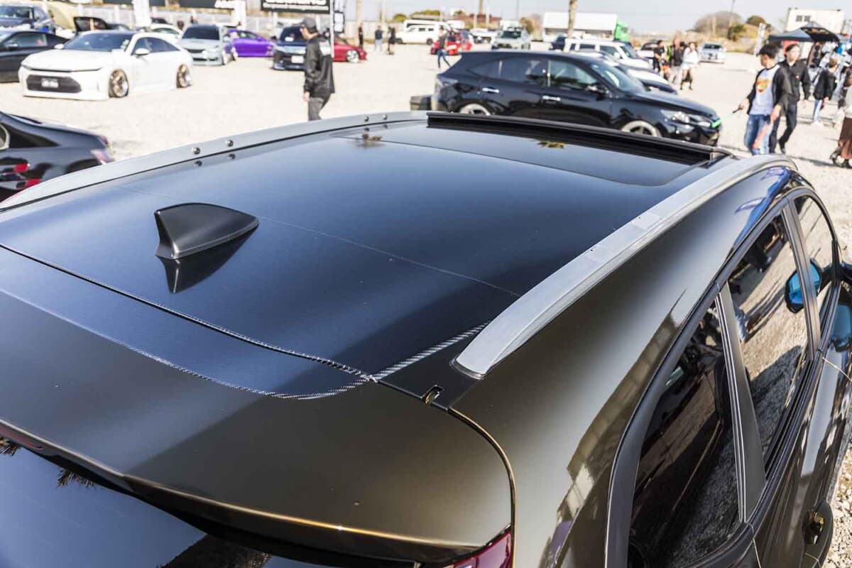 そんなボディは元々ホワイトだったが、ミッドナイトゴールドと呼ばれるカッパー系メタリックのフィルムを貼ってイメージチェンジ。さらにルーフはカーボン調のシートを貼っている。