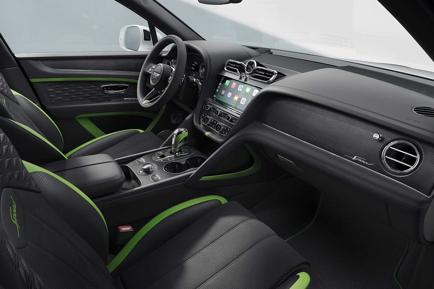 4座仕様では、リアシート背面にまで新たに開発されたプレシジョン・ダイヤモンドキルトが採用され、繊細かつ立体的な美しさが空間を彩る。カラーコーディネートには、スピード専用のカラースプリットが採用されており、落ち着きある濃色のセカンダリーレザーを基調に、シートの外周部やドアトリム、インストルメントパネル側面には、メインカラーが巧みにアクセントとして配されている。