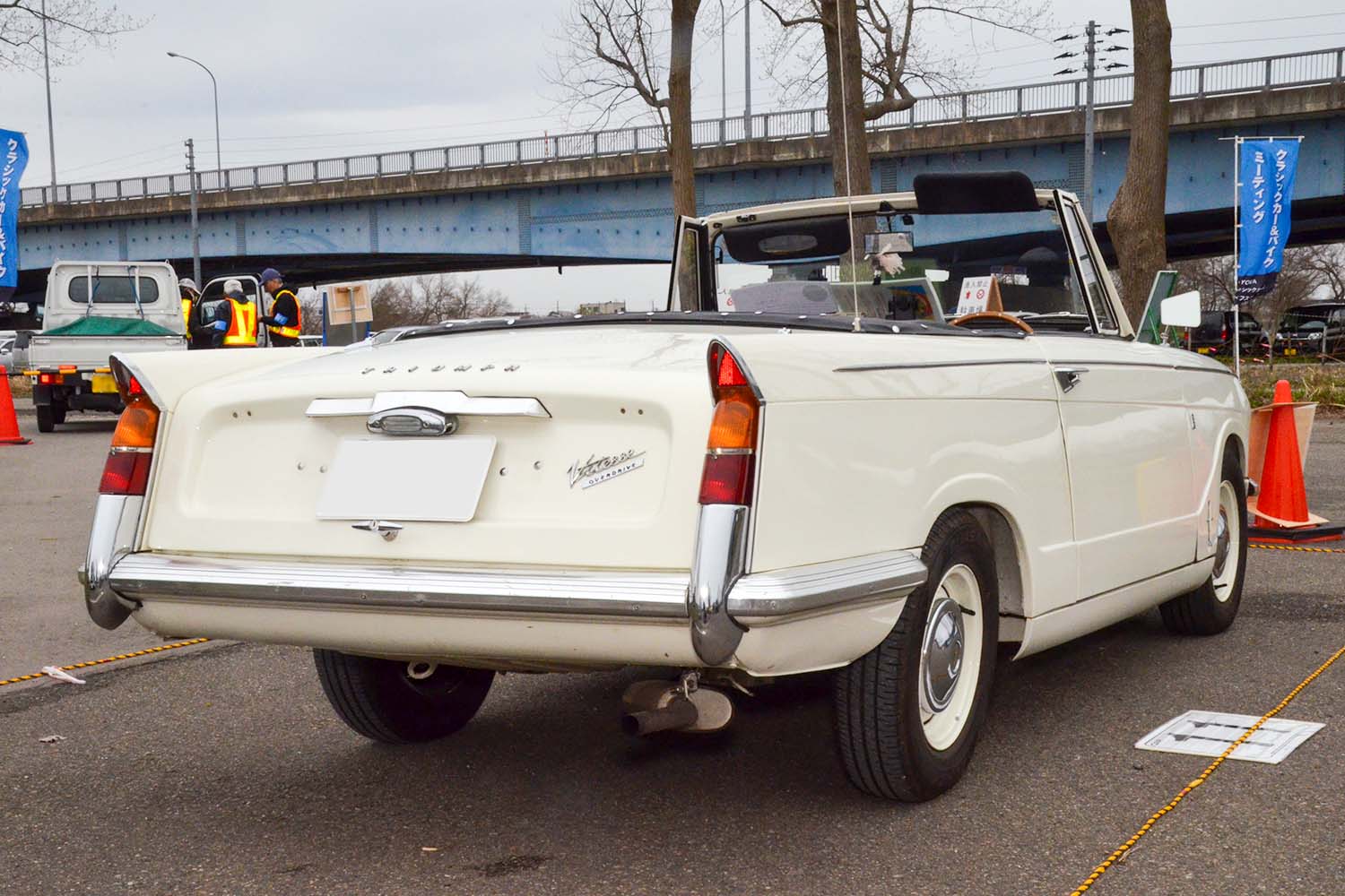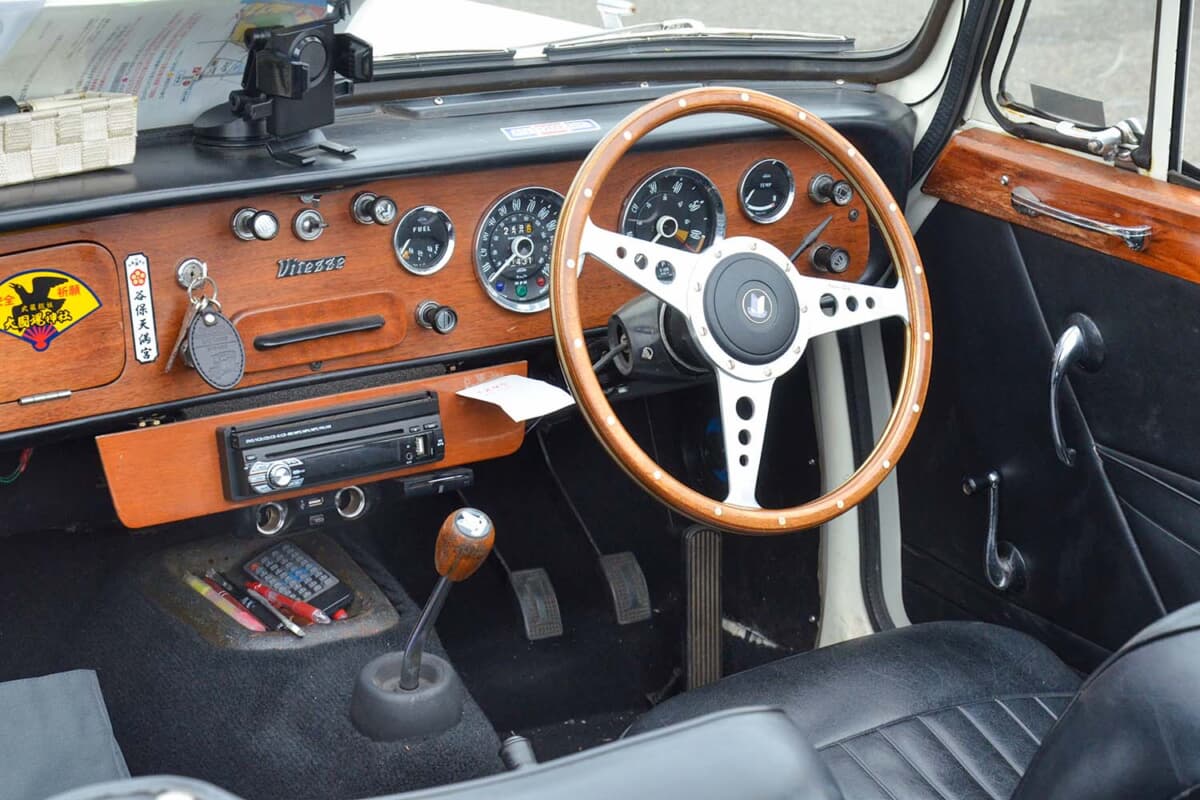 あらためて、会場のトライアンフ。「ヴィテス」のコンバーチブルである。同社のベーシックカー、1L&1.2Lのヘラルドをベースに6気筒エンジンを搭載したひとクラス上のスポーティ・サルーンとして1961年にデビューしたのがヴィテスで、そのバリエーションとして生み出されたのがこのヴィテス コンバーチブルだ。