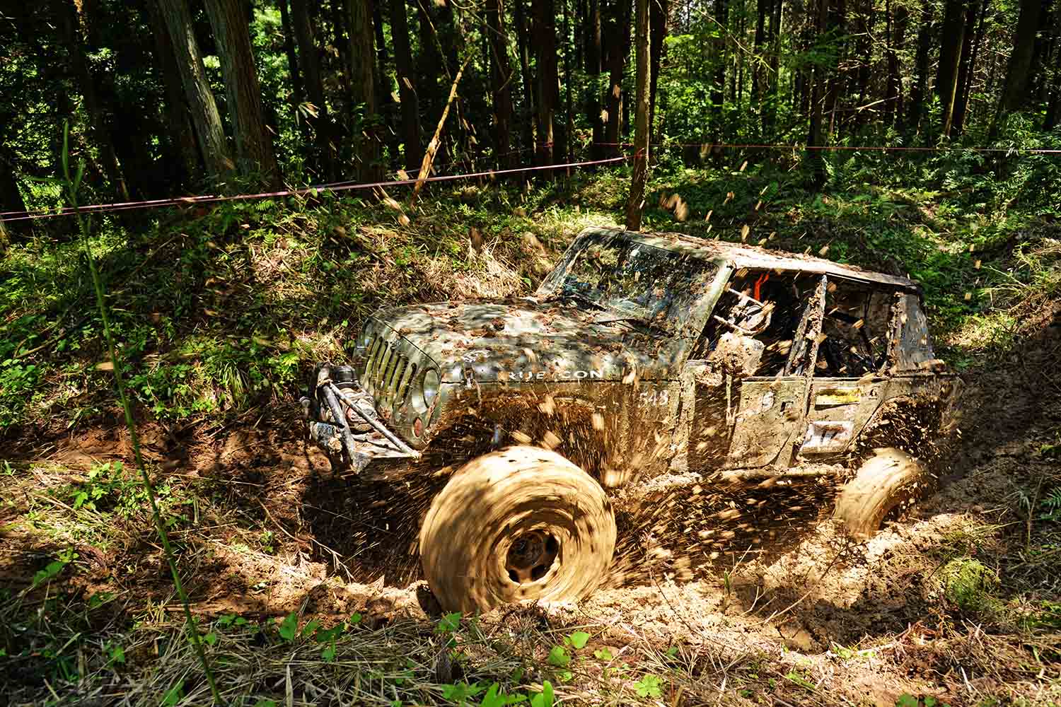 競技は一日目のステージをターミネーターゾーン、二日目のコースステージをプレデターゾーンと呼び、それぞれSS1~5、SS6~9の2日間、全9SSで争われた。コースは森の中にレイアウトされた起伏が伴う鬱蒼とした中でのコースであったが、天候が1日目の日没後に夕立に見舞われたくらいで、概ね晴れの気温35度という真夏の気温の中で行われた。中にはすり鉢状の泥水が車体のウェストラインあたりまで浸かるような池を走り抜けるトリッキーな障害などもある難攻不落なSSが目白押し。そんな中、日本では見かける事のない脱出器具のグラウンドアンカーを用いるSSを用意。予め、競技前に参加者に使い方をレクチャーした上で、この器具を使って臨むSS5のようなセクションがあり、悪路踏破においてのノウハウを初体験しながらコースクリアを狙う。こんなアカデミックな要素も併せ持つイベントなのだ。