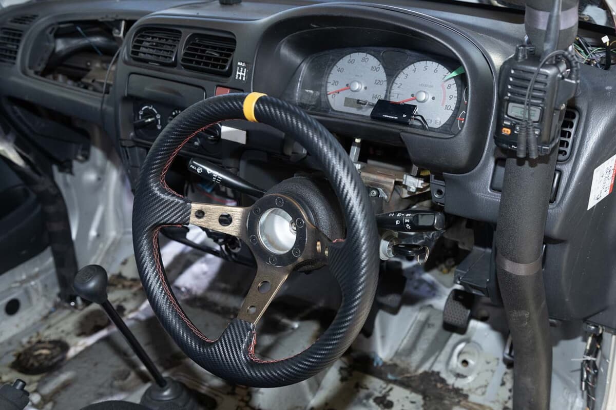 そのひとつが秋田県立大学の自動車部。以前の部活の車両であるHA23型アルトから箱替えを行なったが、やはり3ドアのMT車を手に入れるのがなかなか難しく、ボディが重いのを承知で5ドアを使うことになったという。さらに型式はHA23V型ではなくHA23S型。4ナンバーであるVより装備が豪華なSは街乗りには向いているが、軽量化のために何もかも取り払うレース車両では、逆にデメリットになってしまう。