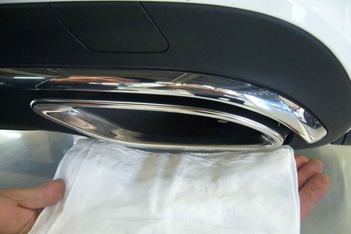 • クリーンディーゼルの証明。排気管に白いハンカチを当ててもまったく汚れなかった