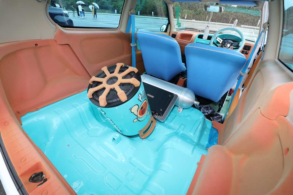 また、「どうせリアシートは使わない」という理由からすべてを取り払って、大きな太鼓のようなサブウーファーとパワーアンプを設置。スピーカーケースに描かれたキャラクターデザインも“太鼓の達人”キャラという遊び心を加えたカスタムを楽しんでいた。