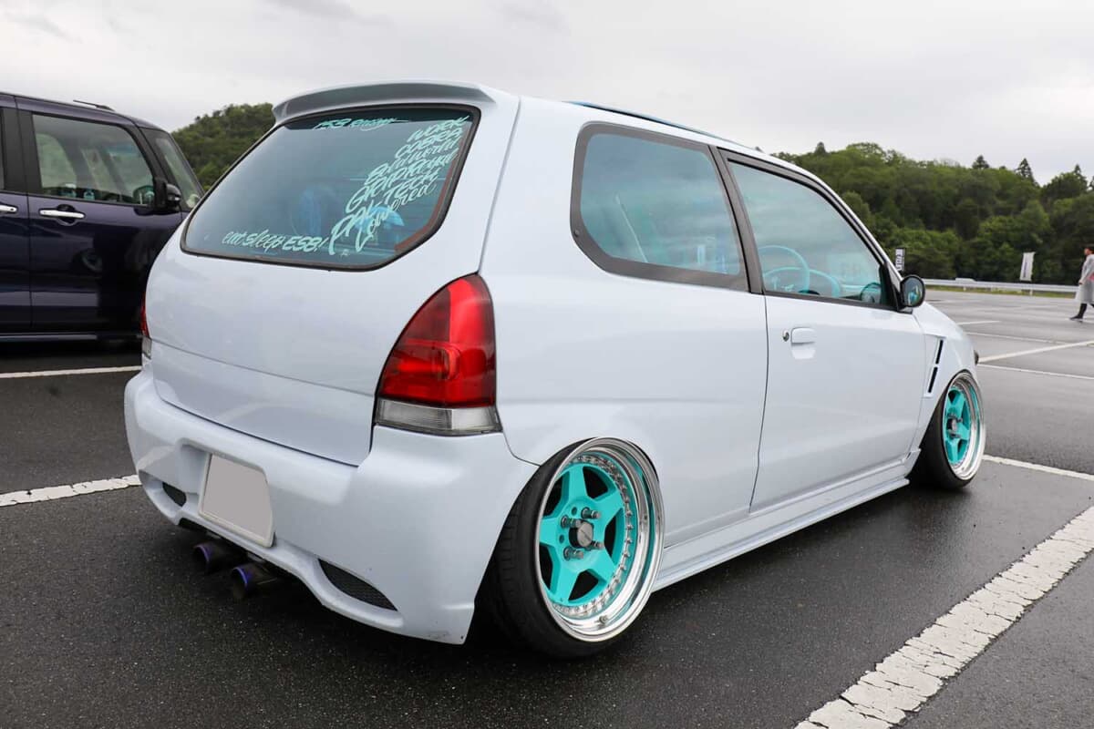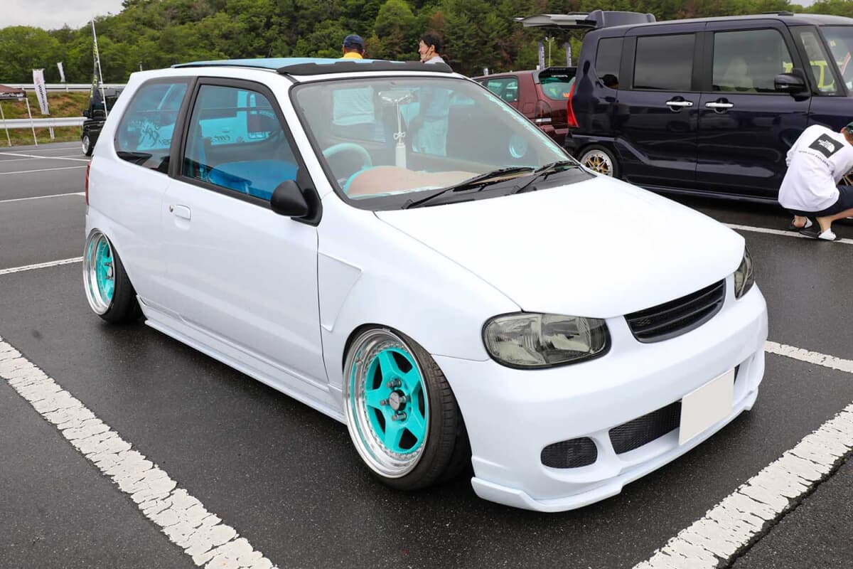 昔から軽自動車が大好きで、これまでの車歴も軽自動車ばかり乗り続けてきたという静岡県焼津市在住の石田哲也さん。そのなかでもスズキHA23型「アルト」の形に惚れ込み、状態の良い中古車があるうちにと、今から8年ほど前にフルノーマル車を購入。いつかは自分好みにしようと考えて車庫に眠らせていたが、大雨の日にその車庫がクルマごと水没してしまったことをきっかけに、修復を兼ねたリメイクをすることを決意したそうだ。その結果が現在の仕様だと説明してくれた。