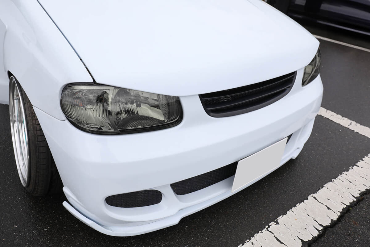 ひと口に軽自動車カスタムといっても現在はさまざまなスタイルが存在しているが、石田さんが狙ったのはUSスタイルとユーロスタイルを融合である。あえてユーロ路線を狙った理由は、このHA23型アルトが欧州系のホットハッチモデルに似ているからだ。そのため、フロントフェイスはVW「ゴルフ」や「シロッコ」のように見えるように工夫。パーツはフロントバンパー、フェンダー、ボンネット、サイドステップ、リアバンパーまで、すべてESB製のボディキットを装着。ヘッドライトはスモーク化させている。