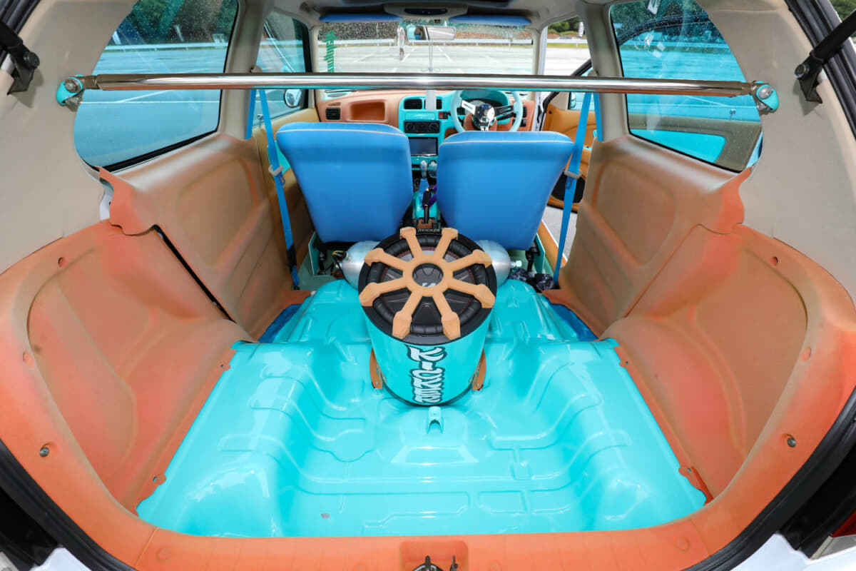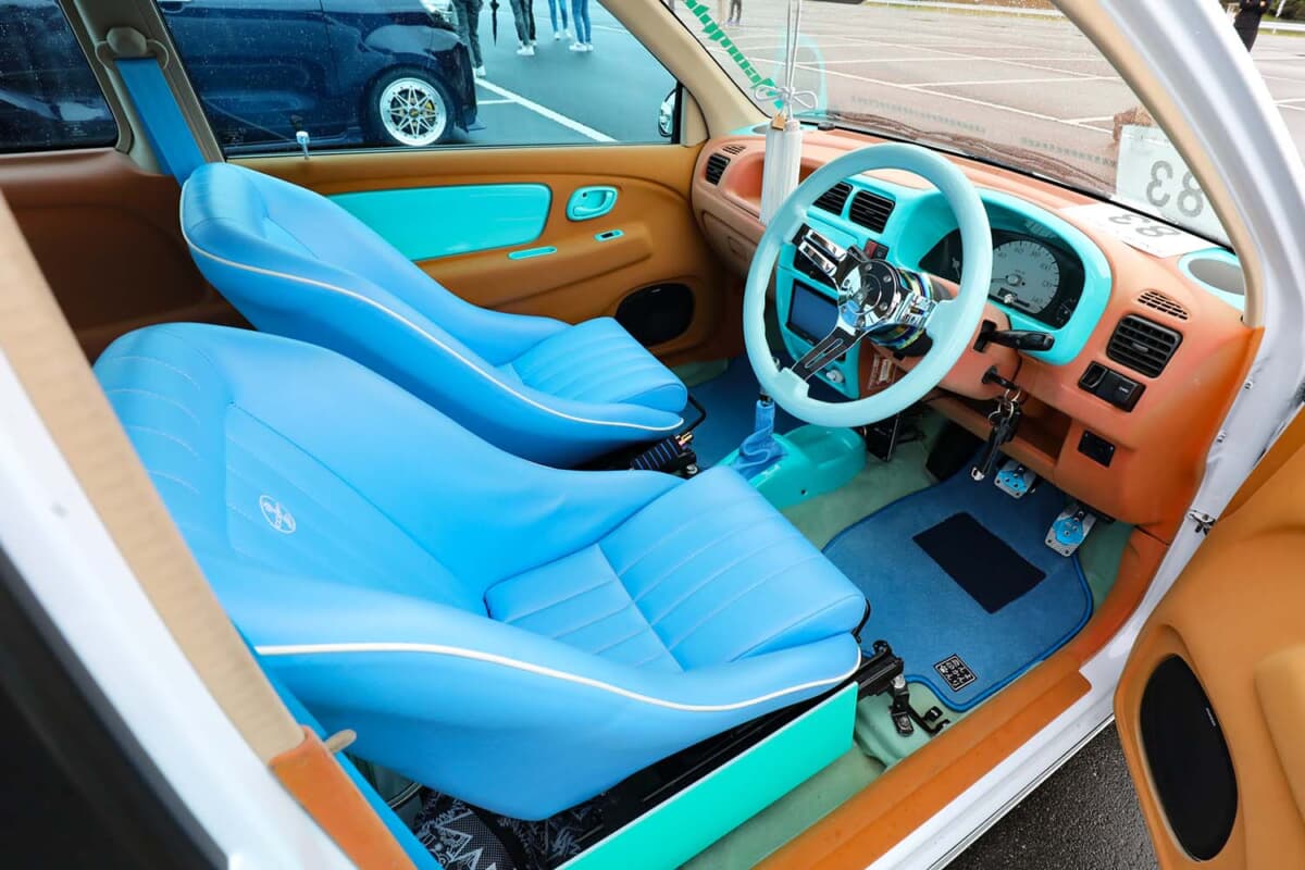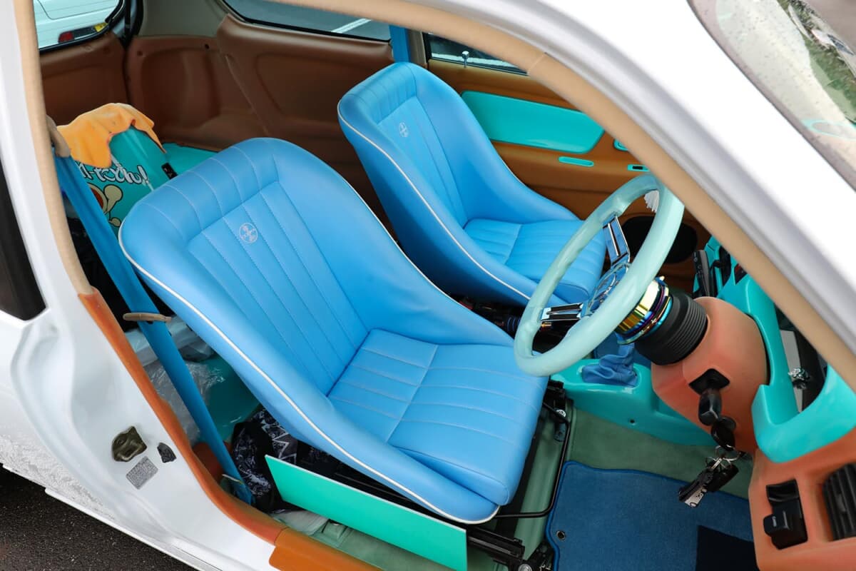 フロント3面以外のウインドウにはスカイブルーのフィルムを貼って全体を統一。さらに内装も水没したため、大胆にすべてを剥いでペイントし、カーペット、ダッシュボード、ドアパネルなどすべて取り外してフルリメイク。ポップなオレンジ色のアルカンターラ生地を貼ったパネルに加えて、ホイールと同色のスカイブルーカラーをフロア、コブラバケットシート、ディープコーンステアリングにコーディネートしている。