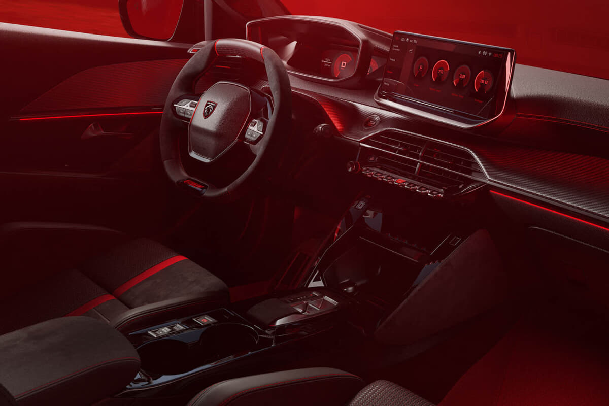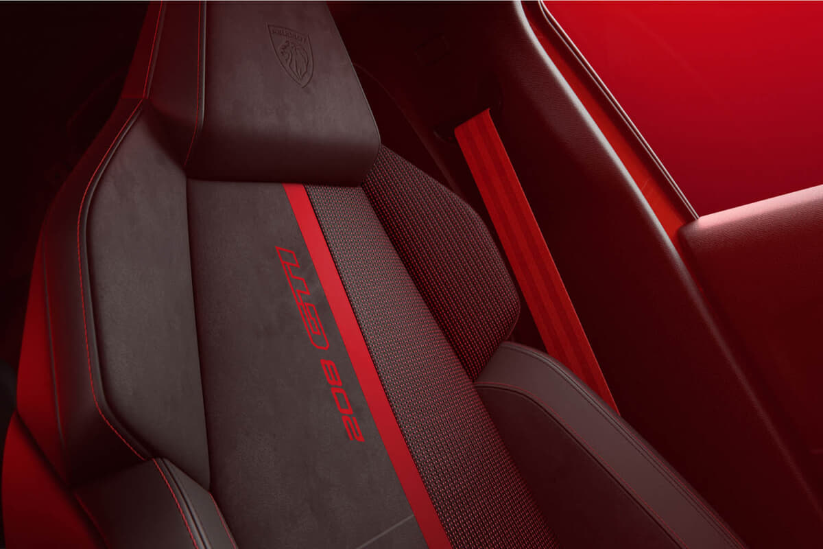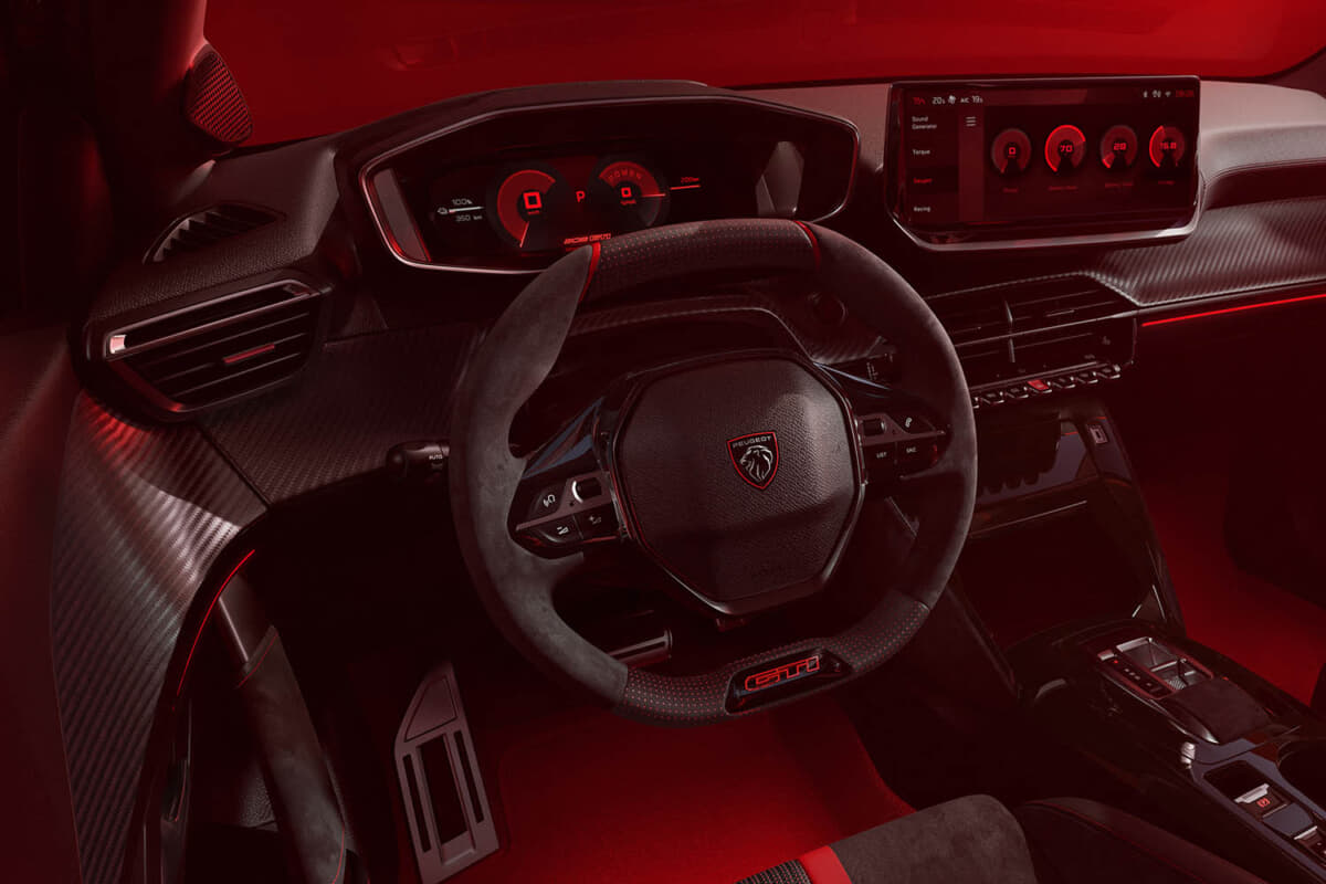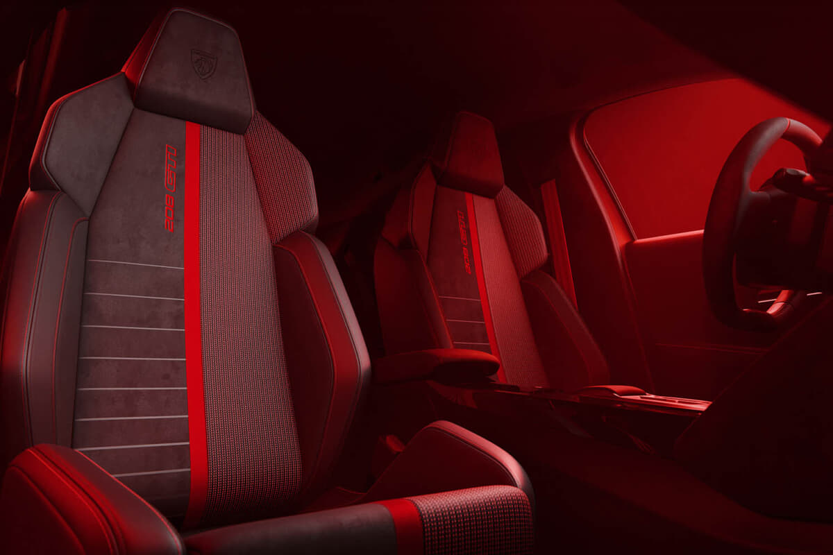 インテリアは赤を基調としたアクセントが随所に配され、GTiの伝統を感じさせる演出が随所に施されている。専用バケットシートには、205 GTiをオマージュした赤いセンターラインやメッシュパターンを採用。アルカンターラ素材のステアリングとともに、スポーティさと上質さを兼ね備える。