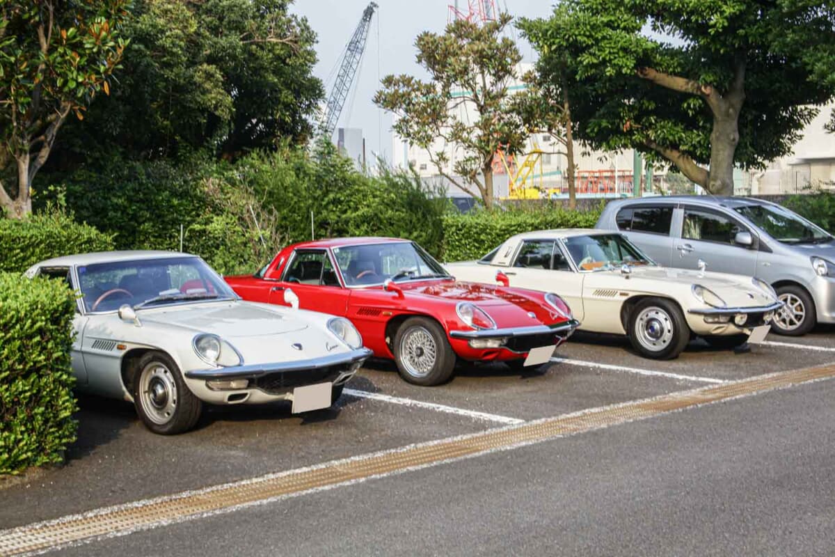• ユーノスコスモとコスモスポーツ。初代と最終のコスモが並ぶ