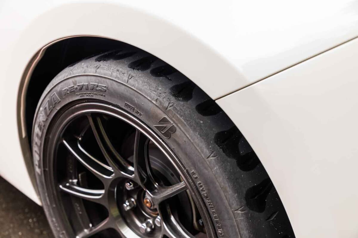 これに17インチのWedsのTC105Xと255/40R17サイズのポテンザRE-71RSを組み合わせて装着しているのだが、よく見るとタイヤのショルダーがかなり溶けている。これはかなりの経験者と思い、“のあさん”に聞いてみると、