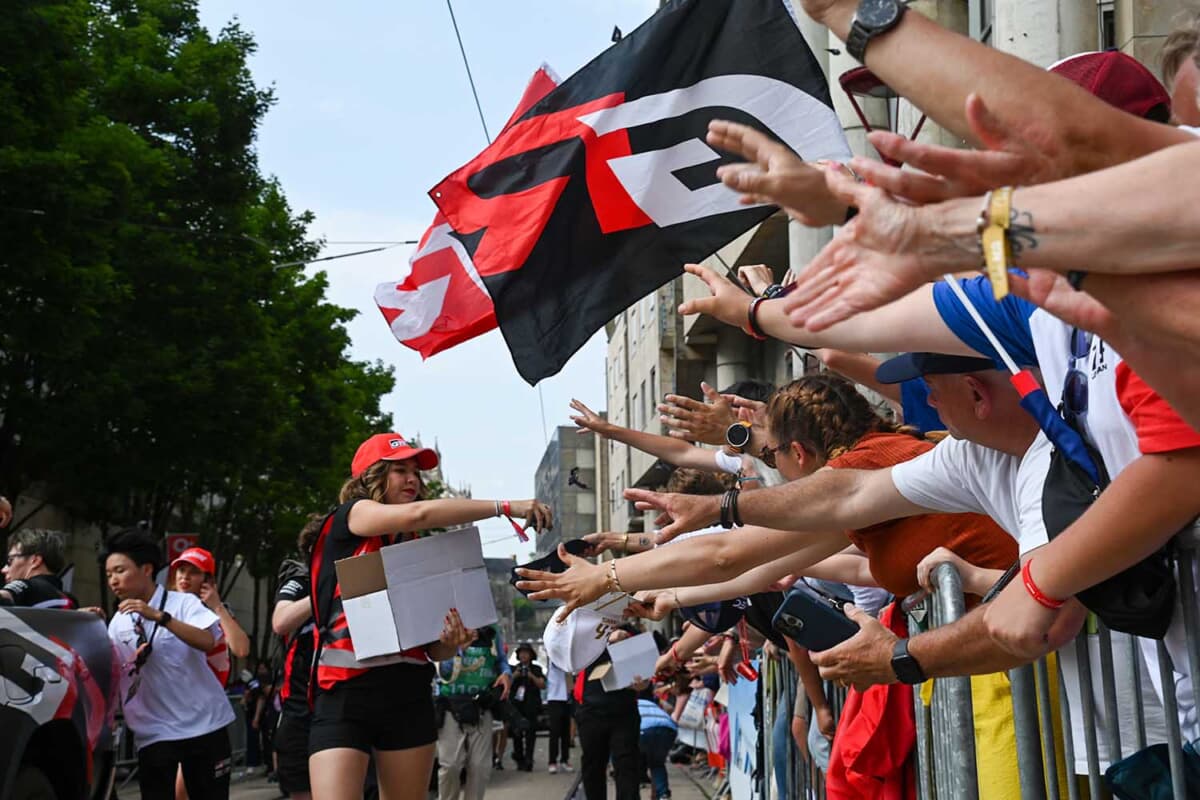到着すると、街にはとんでもない数のファンのみなさん。一体何時から炎天下のなかで待っていたのでしょうか。その力強さとエネルギーには脱帽です。ドライバーパレードでは各チームや自動車メーカーごとにいろんなプレゼントをファンへ向けて投げるので、それをお目当てにしている方も多いんですよ。