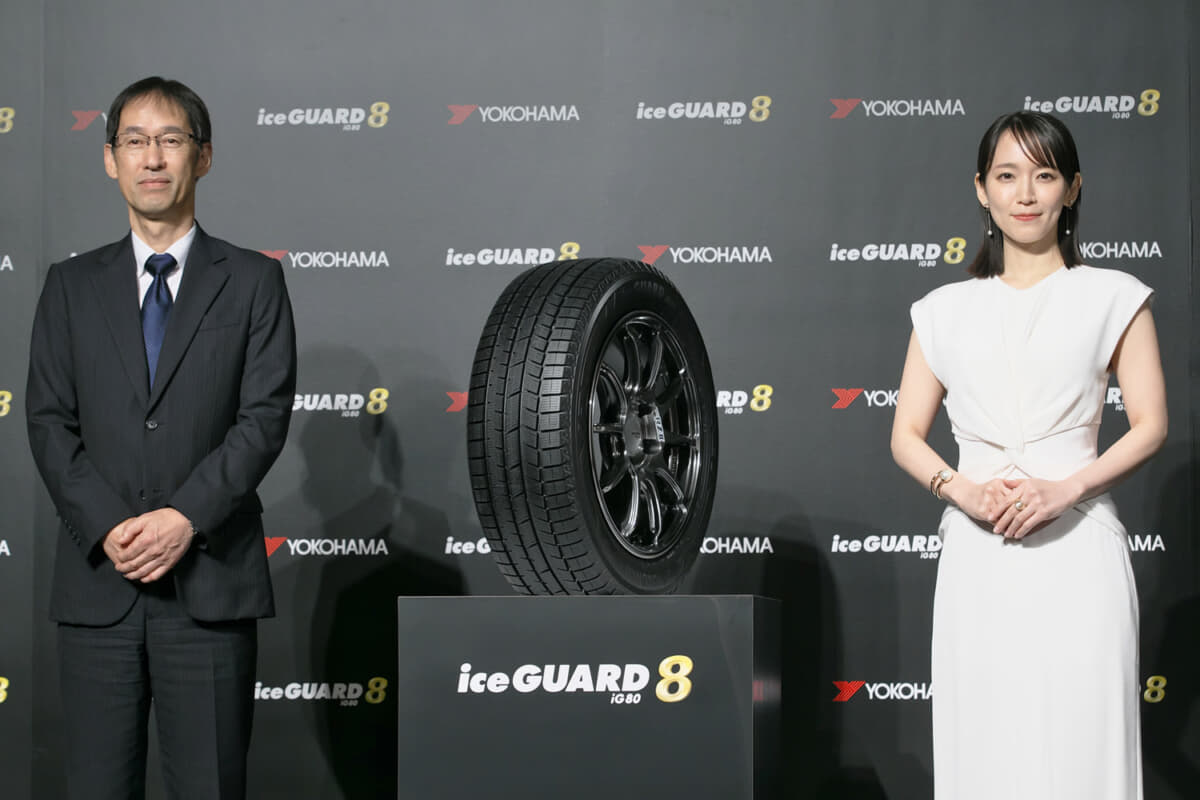 横浜ゴムは第8世代となる新商品の乗用車用スタッドレスタイヤ、「ice GUARD 8(アイスガードエイト)」を発表、9月1日から販売を開始します。発表会にはTV-CMに出演している吉岡里帆さんも駆けつけ、CM撮影の裏話なども話してくれました。素材から一新したアイスガードエイトについて紹介します。