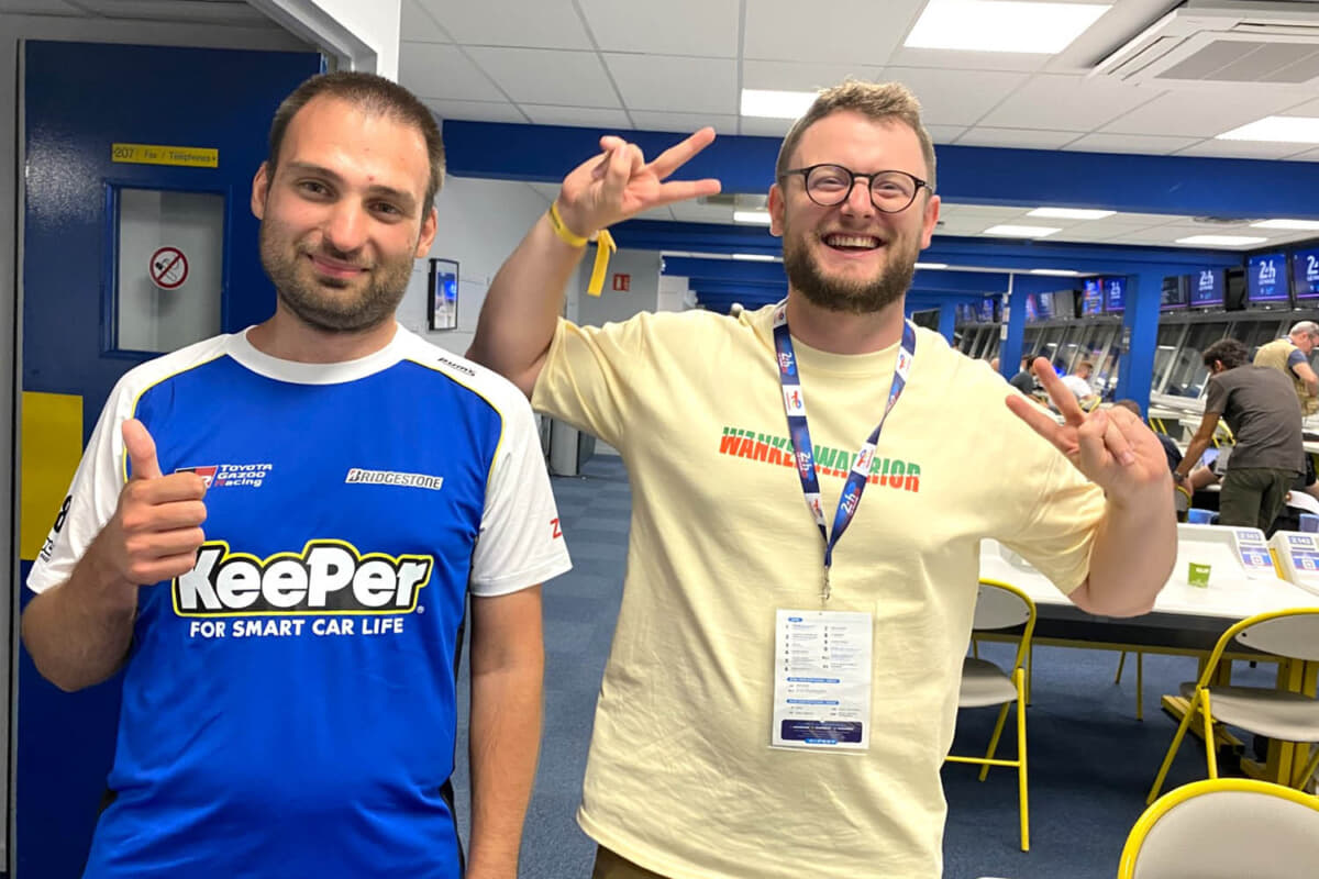 彼は2024年にスーパーGTの取材で初来日し、Tシャツは富士スピードウェイへ行った際にショップで購入したとのこと。初めて観るスーパーGTにとても感動し、数多くのファンで溢れるサーキットや熱心な応援、迫力あるレースに、すっかりファンになったそうです。この方とは初めてル・マンでお会いしたのですが、来年にはどんなサプライズをしてくださるのか、いまからとても楽しみにしています。