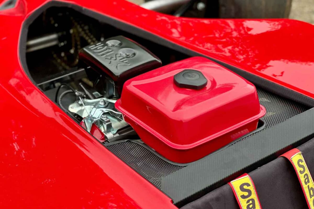 いっぽう、5歳の子どもから大人まで対応するというこの小さなフェラーリ642は、ドライバーズシートの背後に最高出力9psをマークする230ccのガソリンエンジンを搭載。特別製造のスリックタイヤ(前10インチ、後12インチ)は、タイヤウォーマーによるウォームアップ不要で冷えた状態から走行可能とのことだ。
