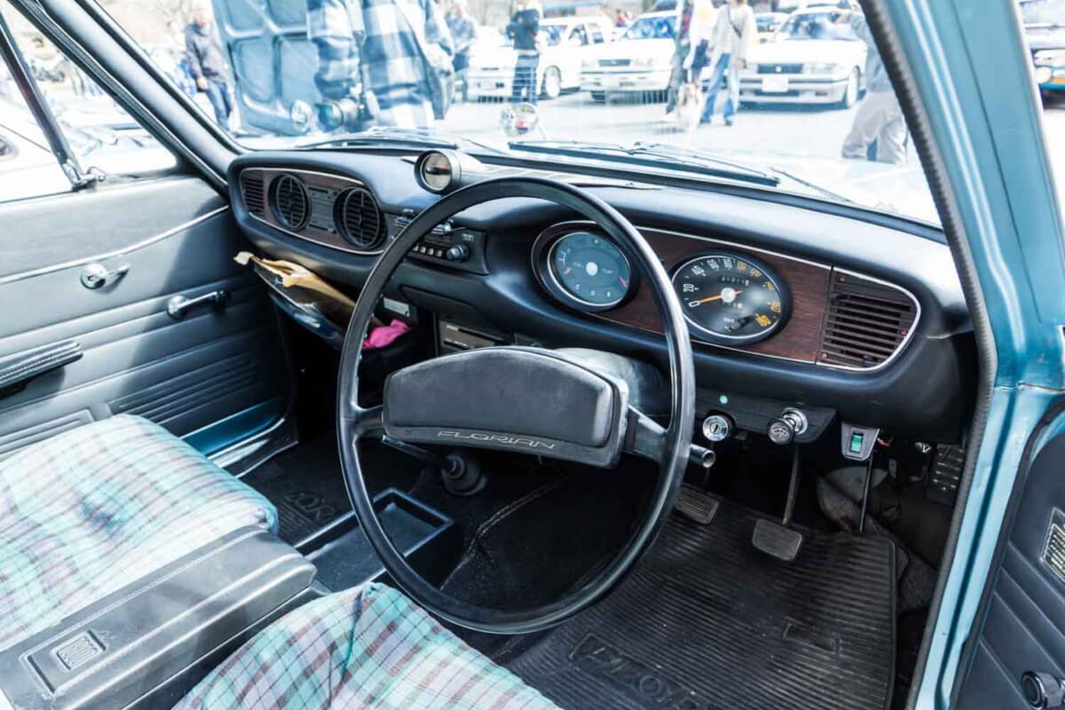車両は、購入時から大きく手を加えておらず、オリジナルのシートにはチェック柄のシートカバーと、レースのヘッドレストカバーが装着されている。左右対称デザインの独特なダッシュパネルも非常にキレイな状態だ。