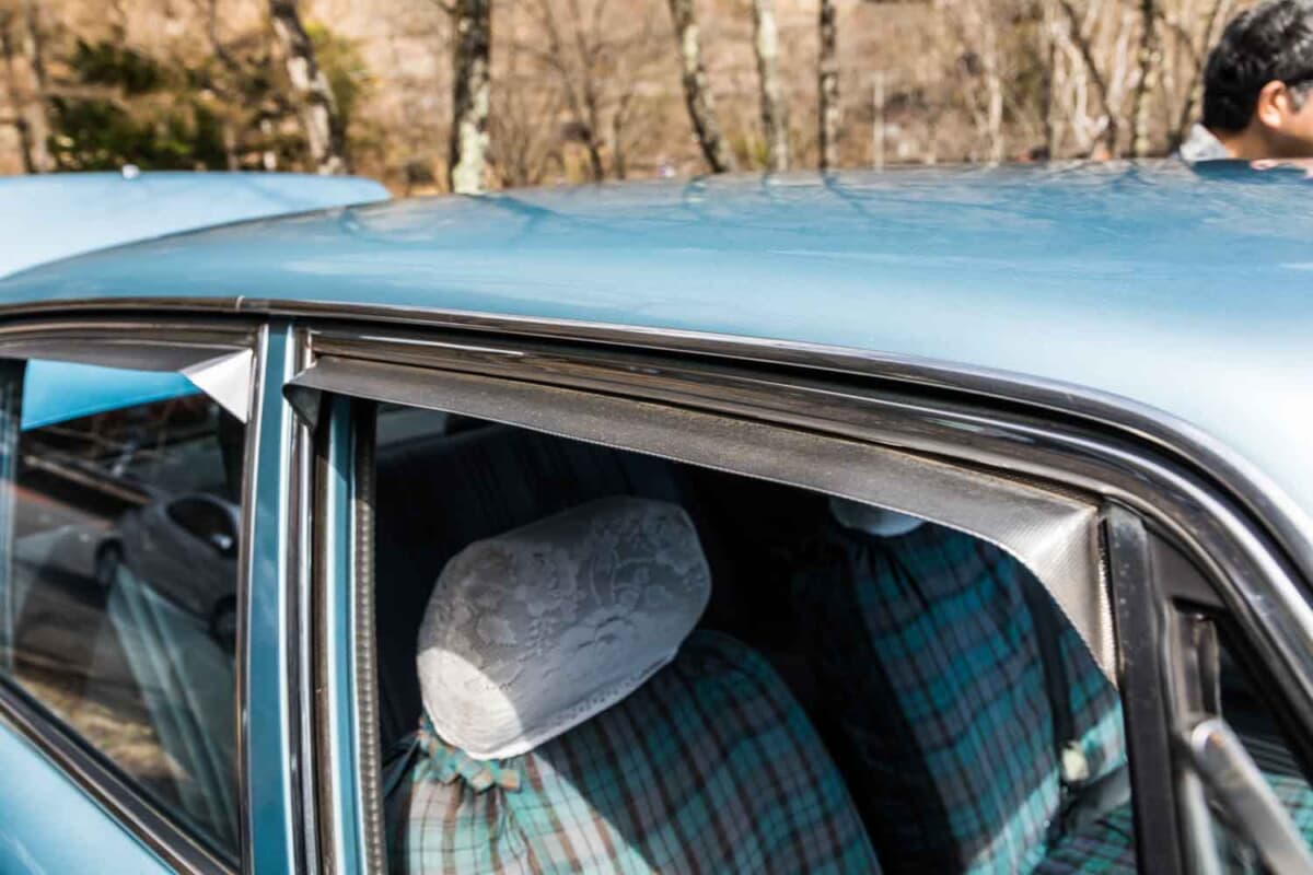 • いすゞ フローリアン:オリジナルのシートには、チェック柄のシートカバーとレースのヘッドレストカバーが装着されている