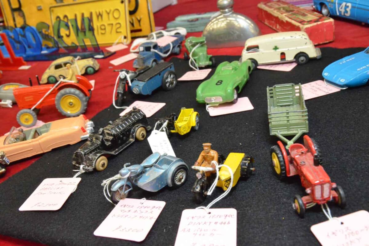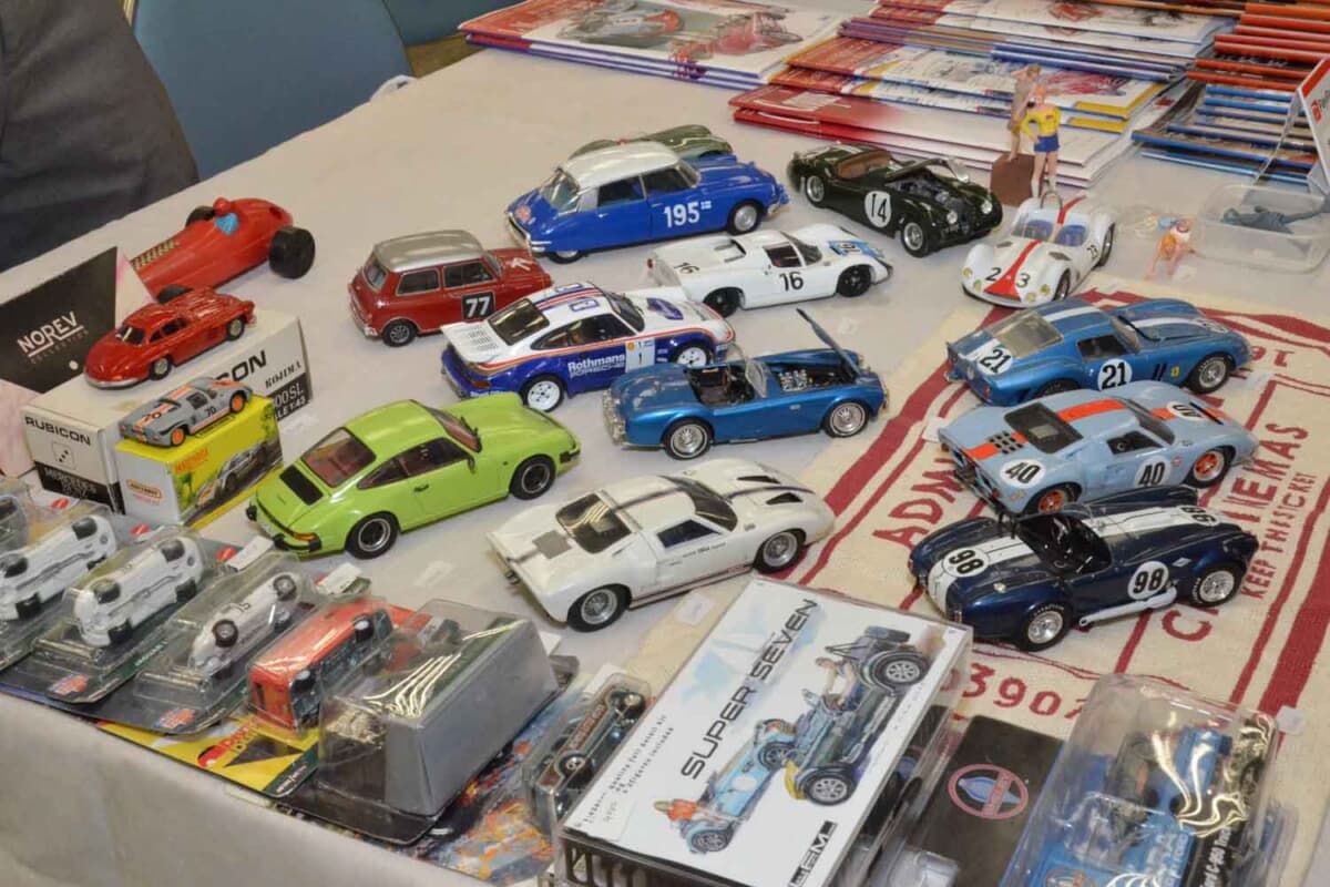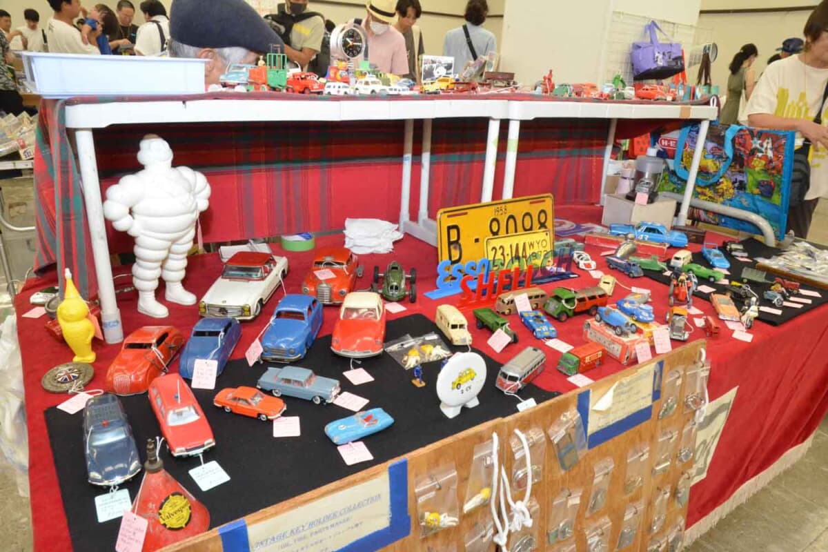 1950〜1960年代のビンテージ・ミニカー、モーター系キーホルダーやピンバッジなど、ブースの雰囲気はまるでパリのレトロモービルのようだ。