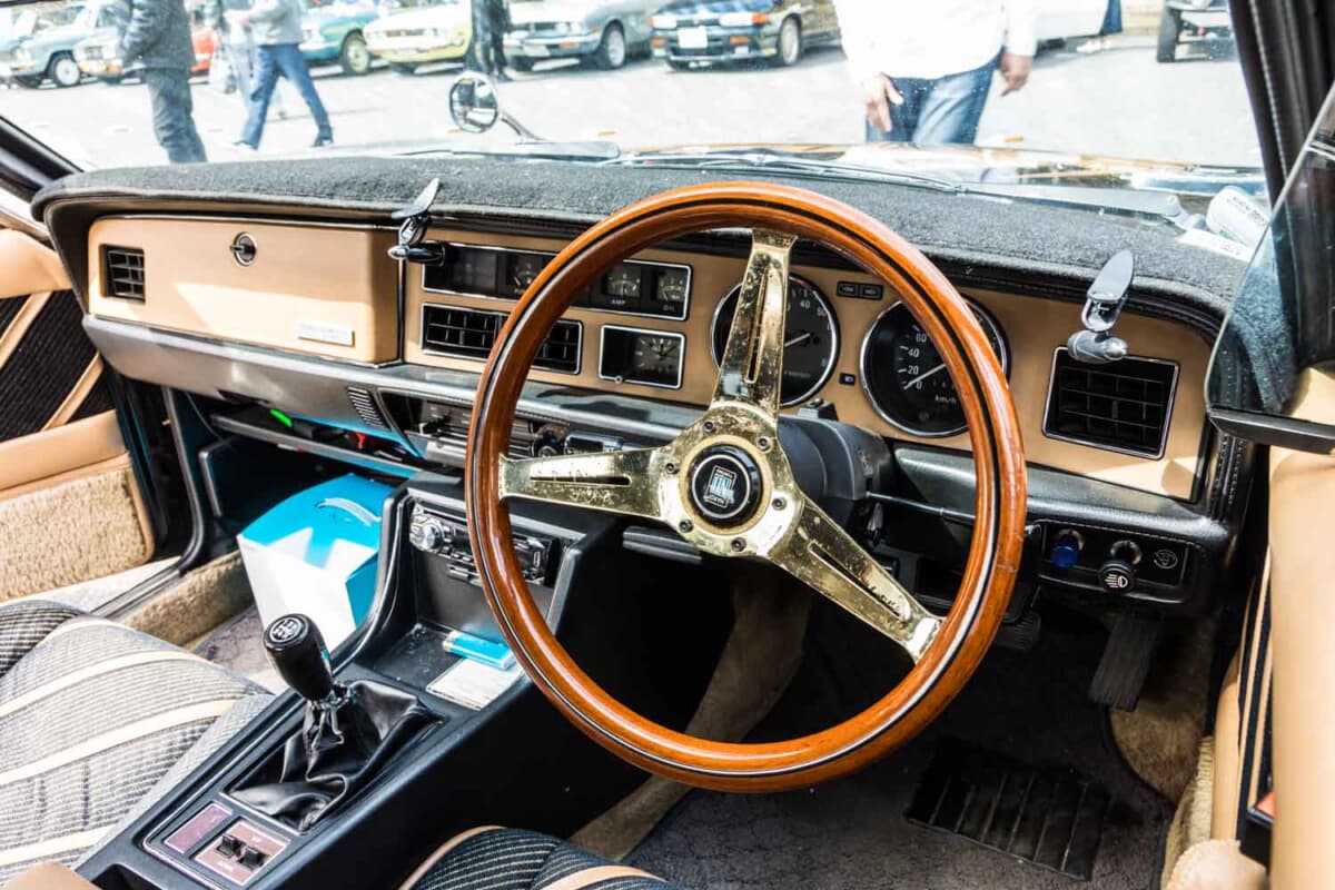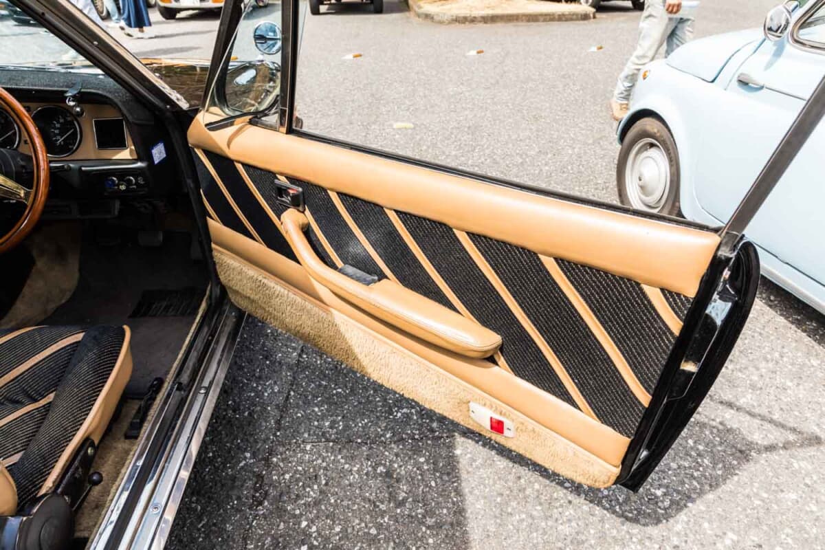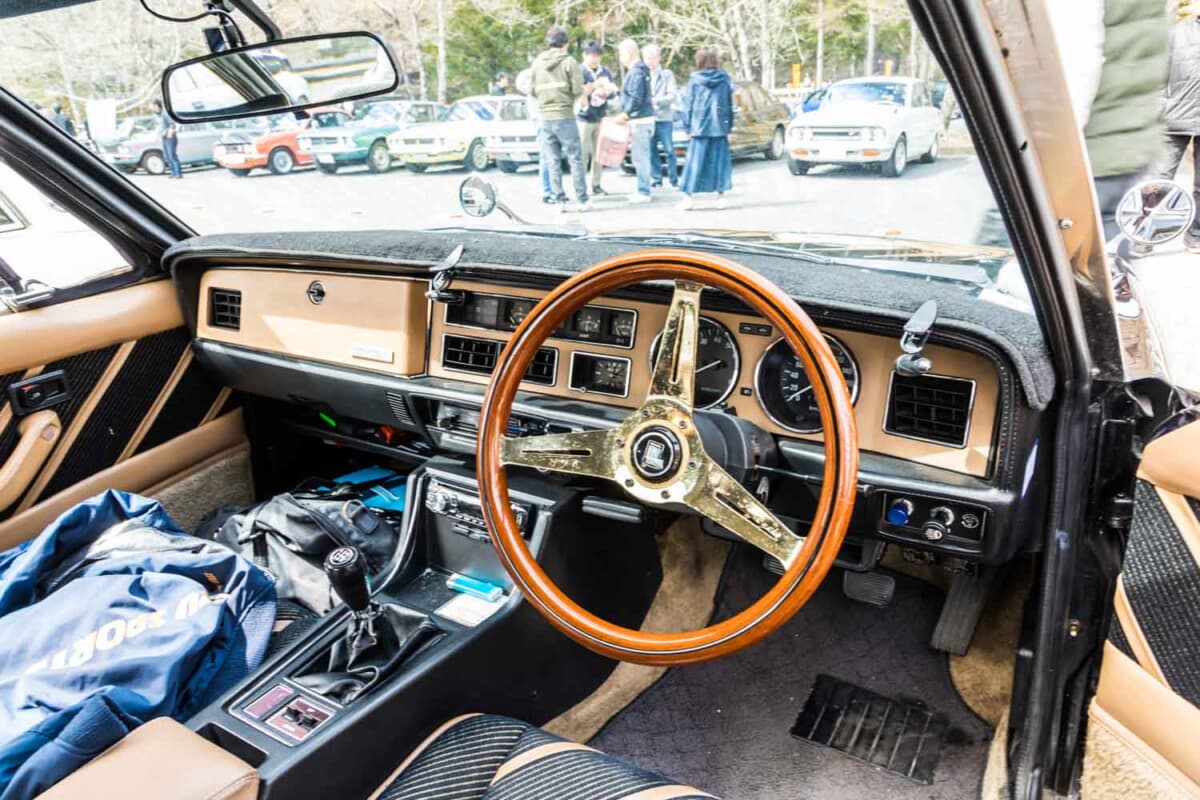 細部のコーディネイトも抜かりがない。ボンネットを開けると、ツインカムエンジンのヘッドカバーはゴールドのシュリンクペイント、オイルキャップもゴールドに統一。ナルディ製の金メッキステアリングも山岸さんの手によるものだ。全体の雰囲気は、同時代のポンティアック・トランザムのファイヤーバード仕様を彷彿とさせる。