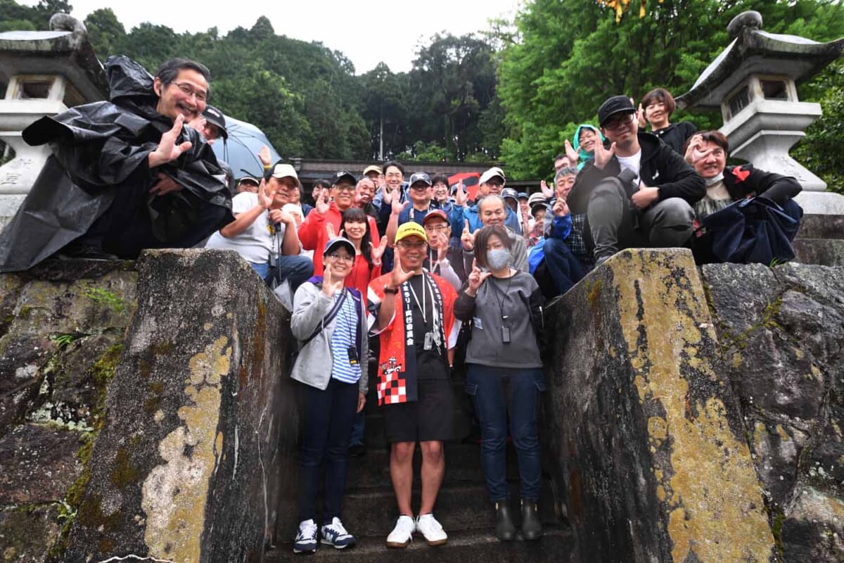 午後からはあいにくの雨模様となり、予定されていたコースウォークはキャンセルに。しかし、ラリージャパンの象徴的なスポットのひとつ、熊野神社では、傘をさしながら勝田選手と一緒に参拝・散策を楽しむ時間が用意されました。
