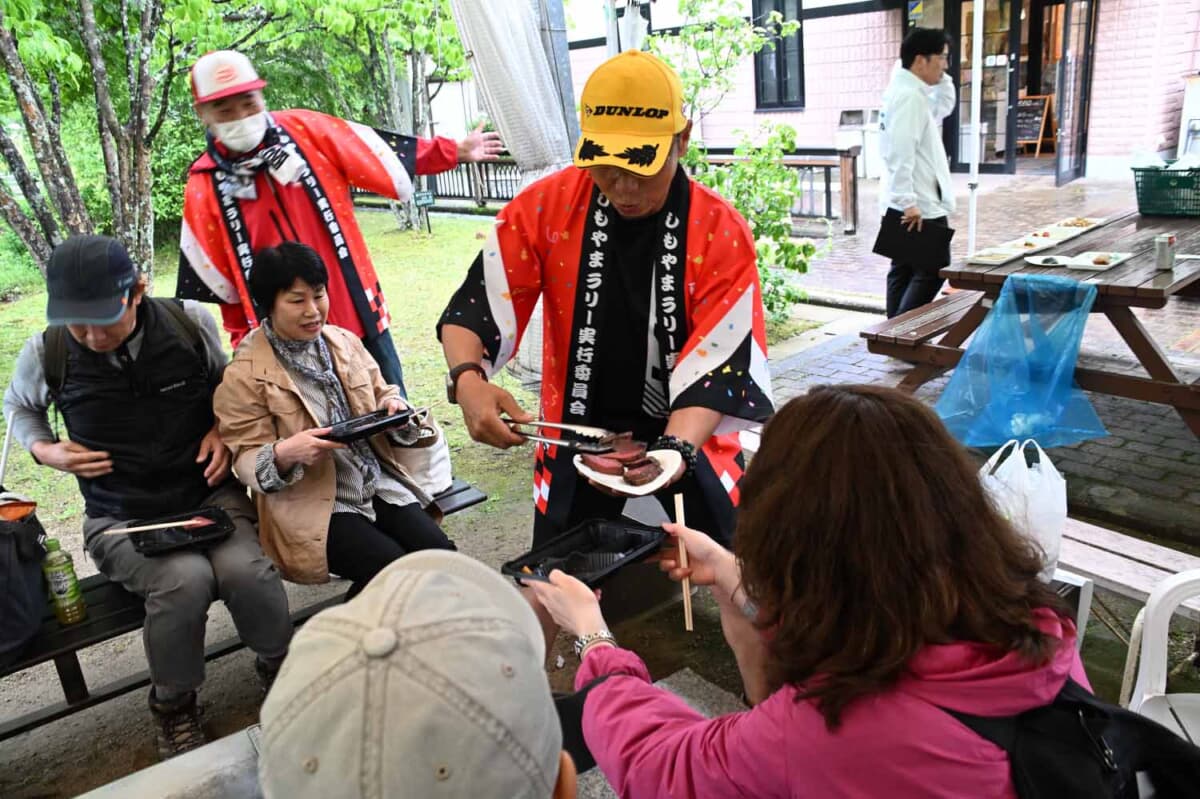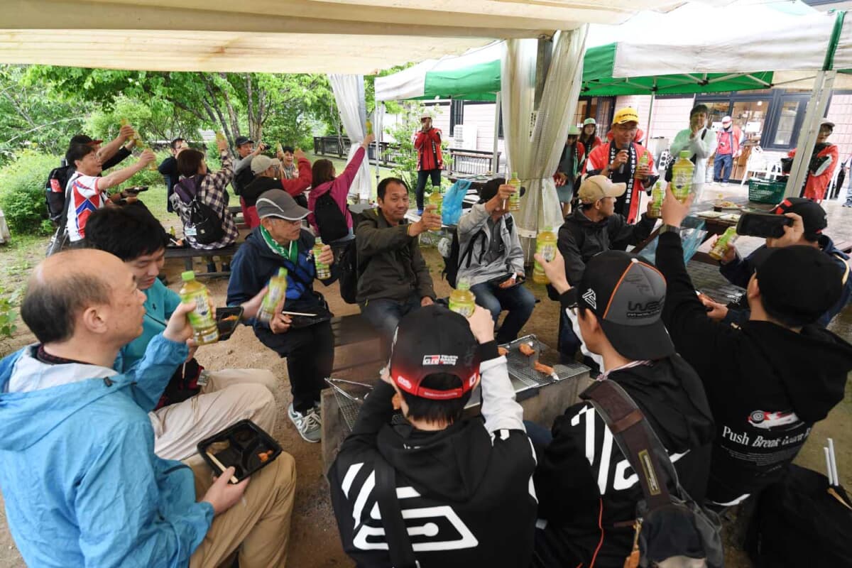ツアーの締めくくりは「手づくり工房 山遊里」でのバーベキュー。ラリーファンにとっては、勝田選手と間近に交流できる夢のような時間となりました。食事をしながら直接質問を投げかけたり、記念写真を撮ったりと、参加者それぞれが思い思いのひとときを過ごしました。