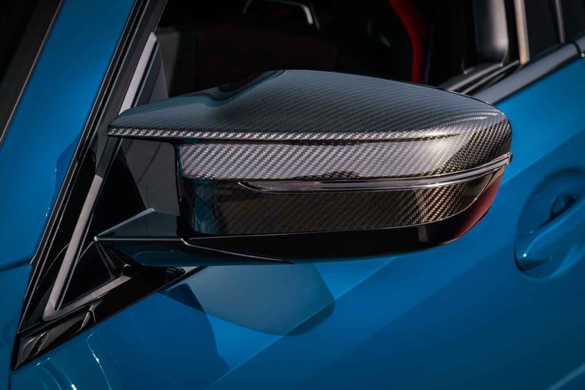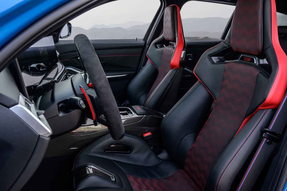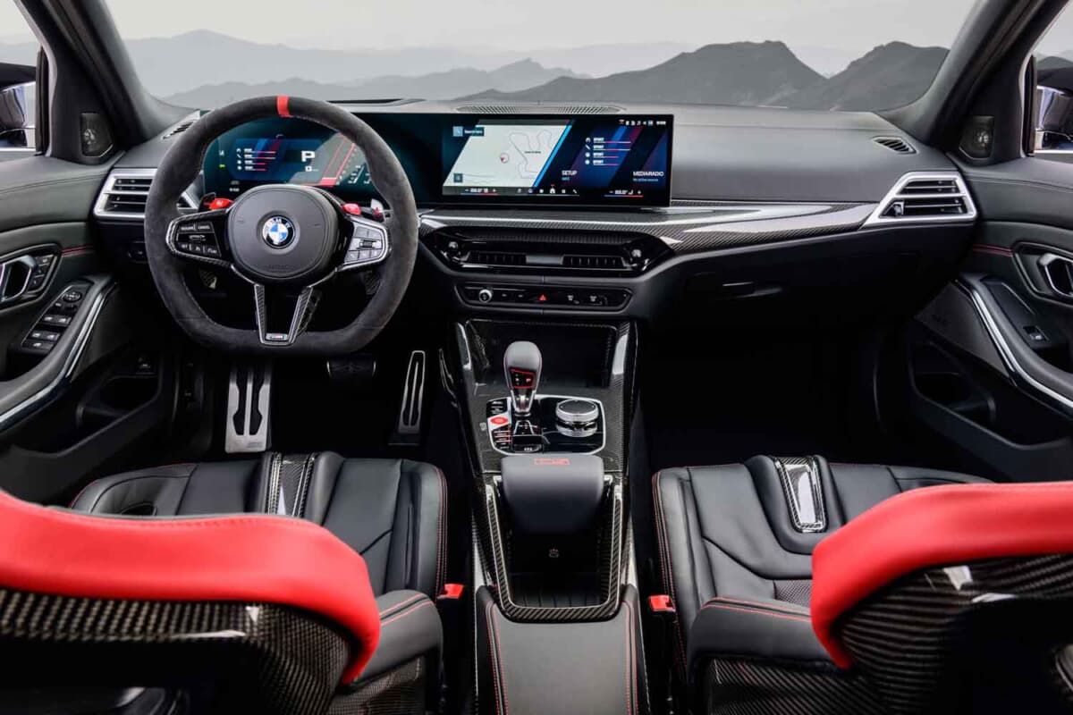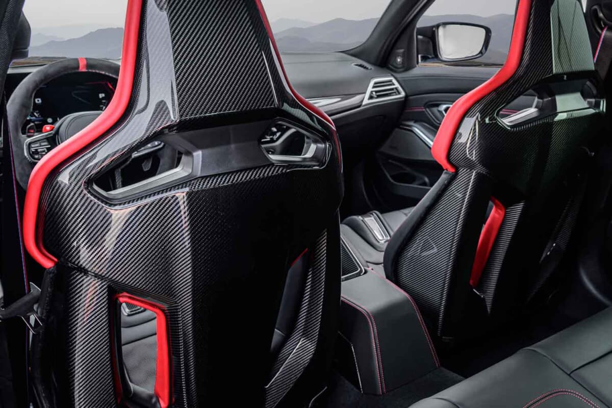 インテリアでは、センターマーク付きMアルカンターラステアリングやMカーボンファイバートリム、CFRP製センターコンソール、Mカーボンバケットシートなど、スポーツ走行を意識した装備が標準搭載される。一方では大人3名が快適に座れるリアシートやワゴンとして十分な荷室スペースを確保し、実用性も疎かにしていない。