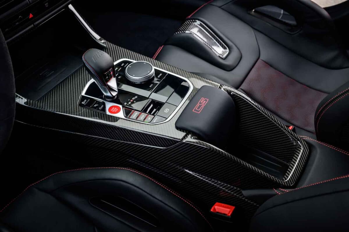 「CS」の名が示すとおり「Competition Sport」の精神を体現し、CFRP(炭素繊維強化プラスチック)製のボンネット、キドニーグリル、ドアミラーキャップ、リアディフューザーなどを採用して軽量化と高剛性を両立。フロントライトにはイエロー発光のアダプティブLEDヘッドライトを採用し、ブラックとレッドのコントラストによる専用バッジで特別感が強調されている。