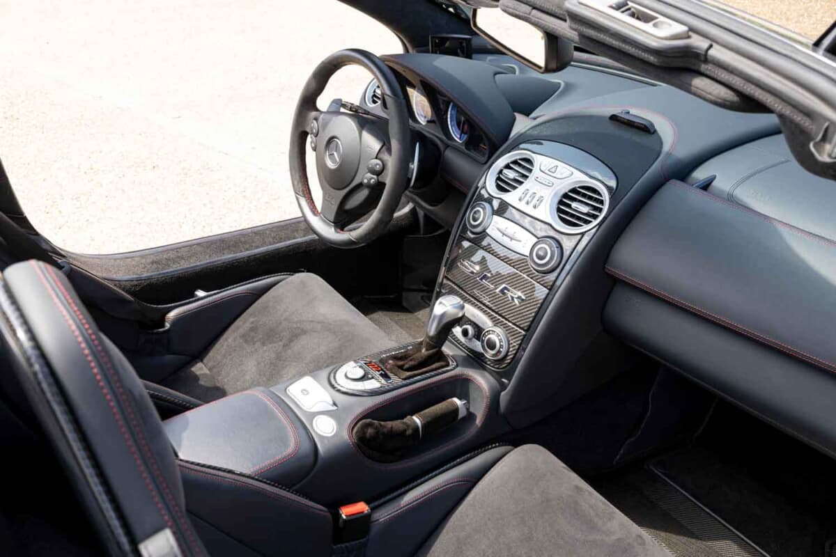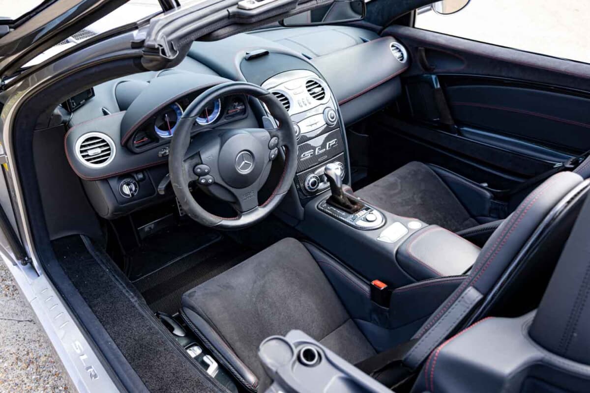 今回出品されたのは「SLRマクラーレン722Sロードスター」。722という数字は、1955年のミレミリアでスターリング・モスがスタートした午前7時22分、および300SLRのゼッケンに由来する。マクラーレンによって150台限定で生産されたこのモデルは、シリーズのなかでも特別な存在である。