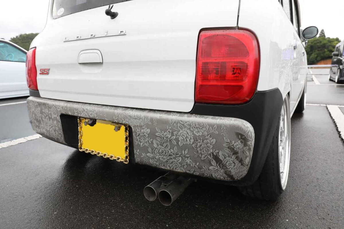 リアバンパーにも独自の加工が施されている。純正バンパーの一部にバラ柄のレースのカーテンを巻き付けて缶スプレーで塗装し、乾燥後にカーテンを外すと柄だけが残るという技法だ。