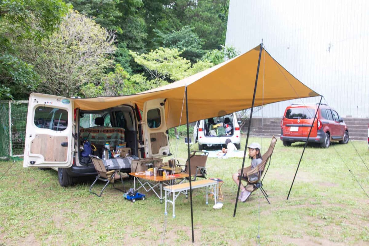 カングーの荷室高は十分で、ゴルフトゥーランで抱えていた積載面の不安もすっかり解消された。最近では設営がひとりでもできるタープなども用意し、キャンプはさらに快適になってきた。