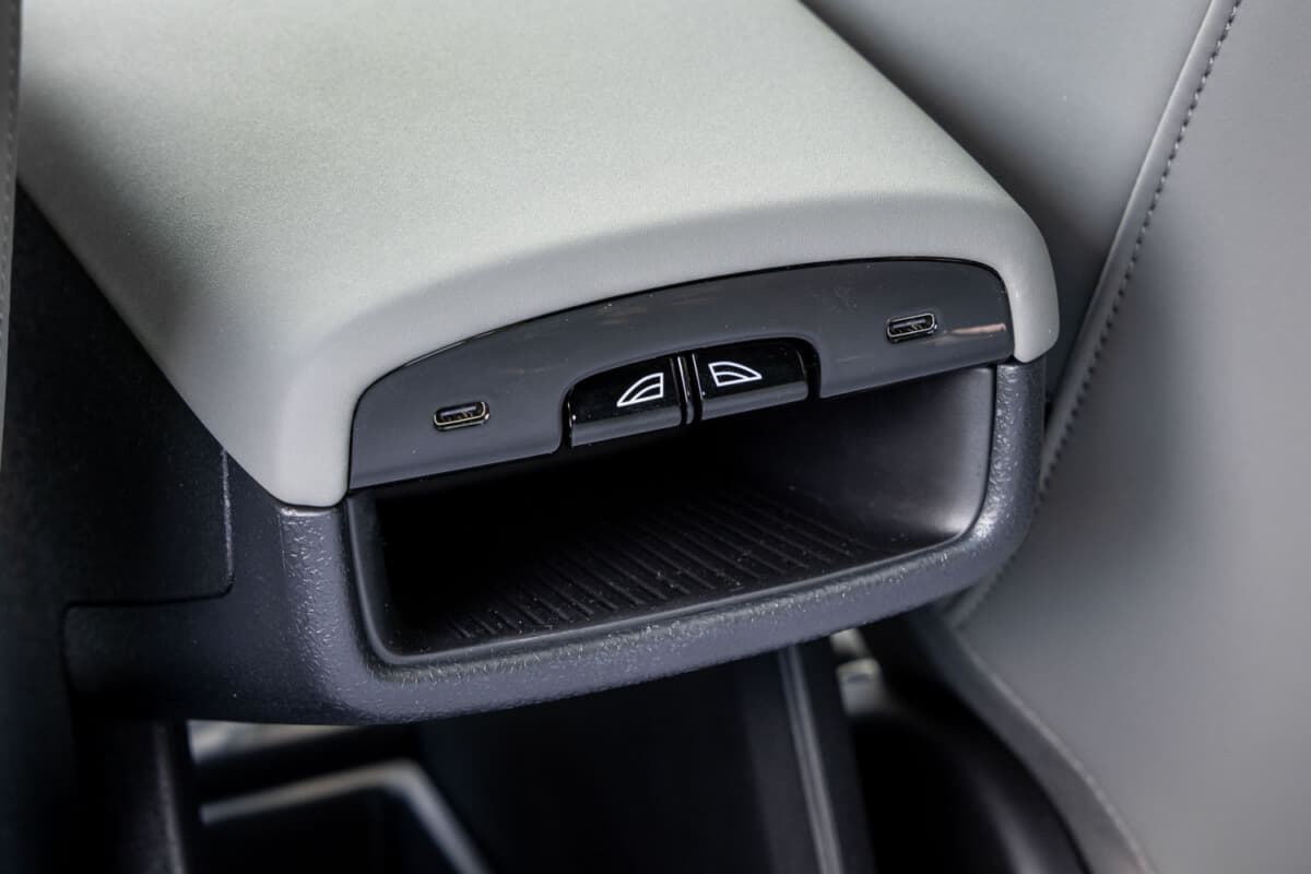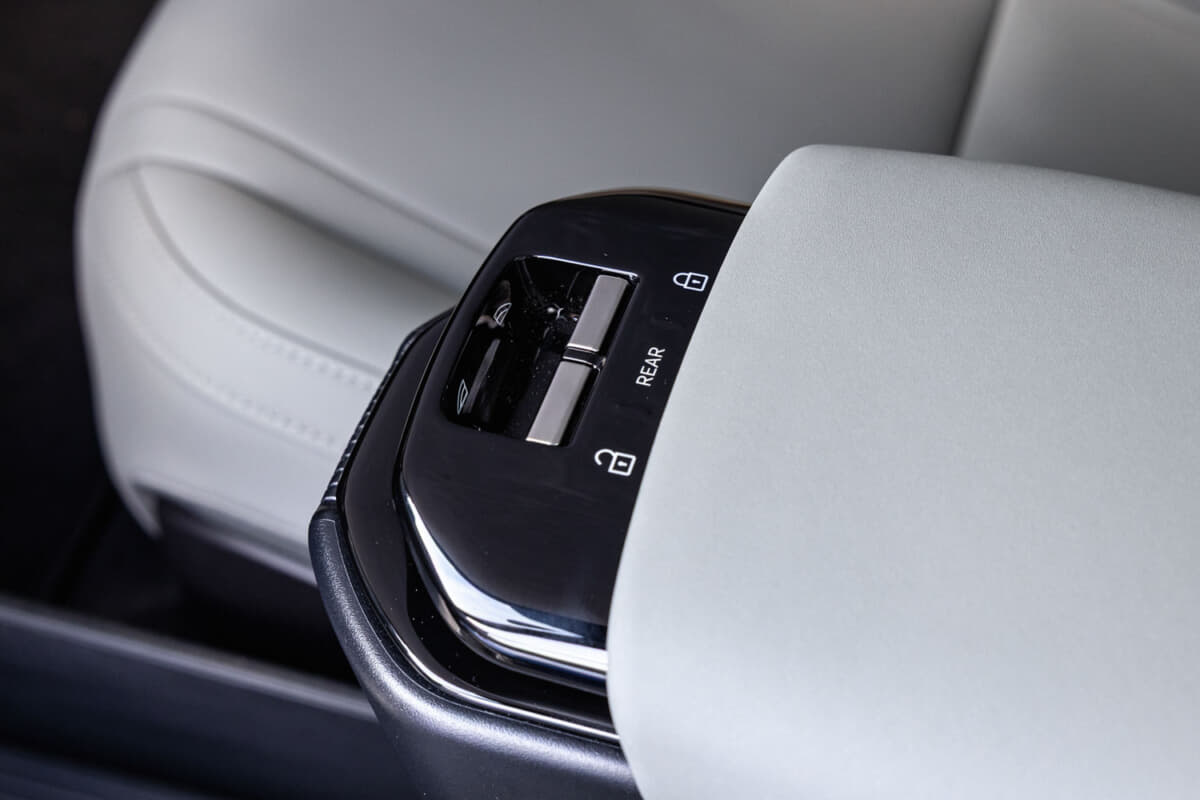 • EX30 Cross Country Ultra Twin Motor Performance:リアのパワーウインドウスイッチはセンターコンソール後方に設置。センターコンソール前後にスイッチをまとめることで配線が短くなり、軽量化と省資源となる
