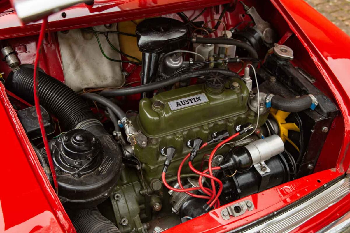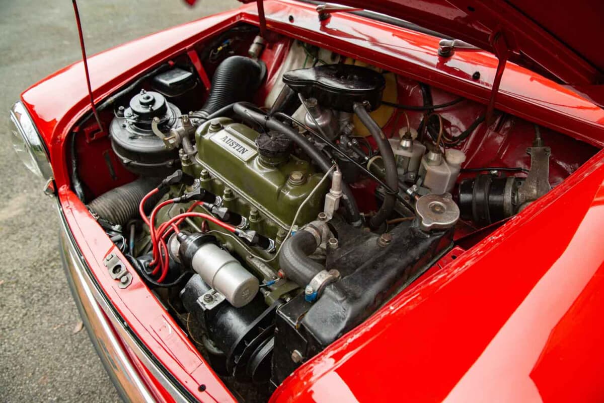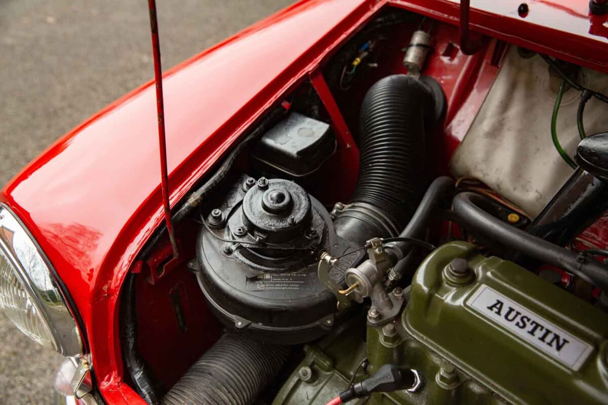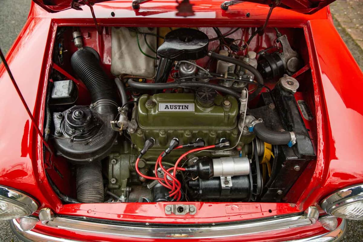 いっぽう、イシゴニス式(エンジン下に変速機を配置)に横置きされるパワーユニットは、BMCの名機「Aタイプ直列4気筒OHVエンジン。排気量はMk-I最終期と同じく848cc(850)、998cc(1000)、そして「クーパーS」用としてパワフルな1275ccが搭載されたが、その一方で「S」のつかない標準型998ccクーパーは廃止。かわって「ミニ1000」がスポーツモデル以外のシリーズ最上位モデルとなり、それ以前にはオプションだった「デラックス」トリムが標準装備されることになった。