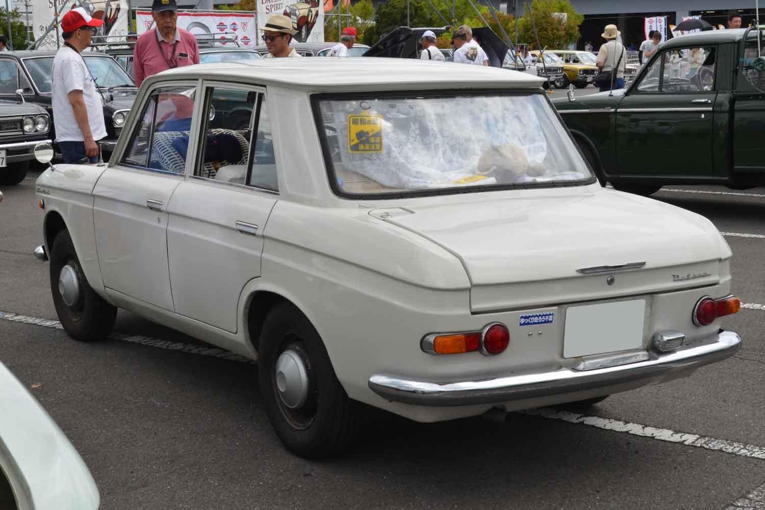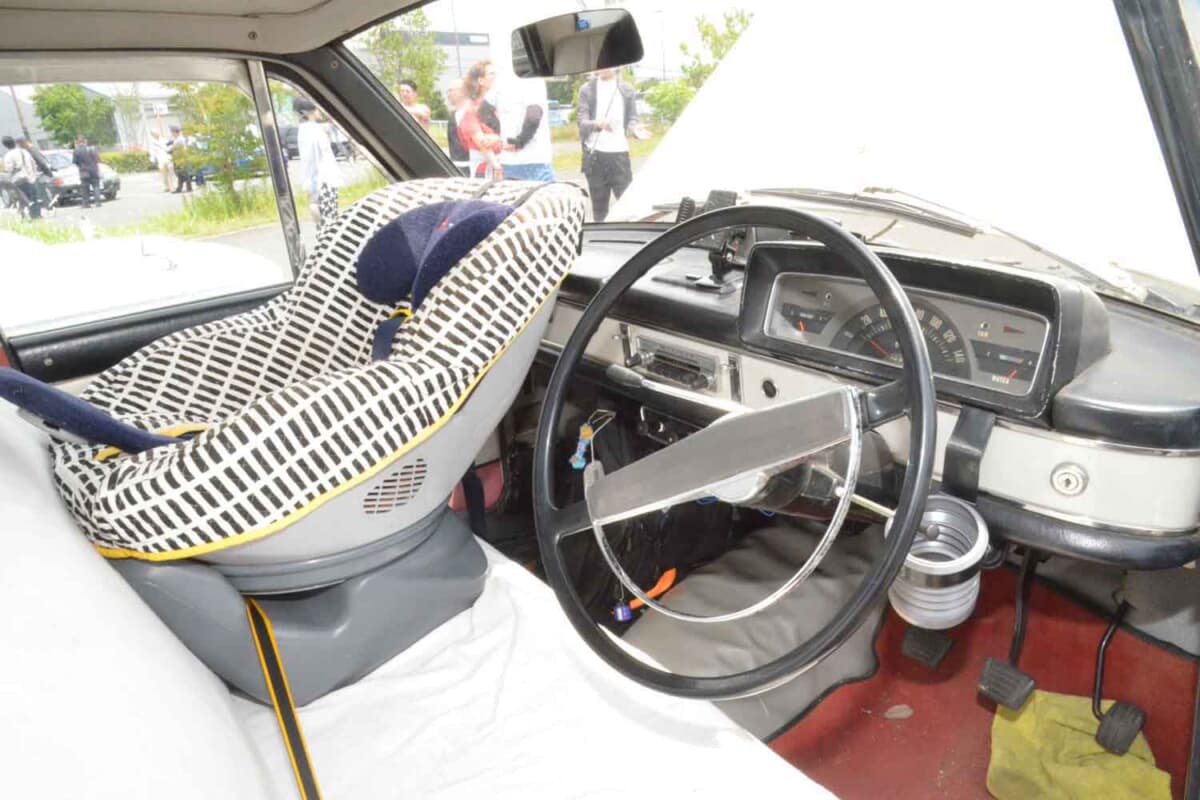 その中でもダットサン/日産ブルーバードは初代310型からU12型まで、20台以上の歴代モデルが参加リストに名を連ねた。今回紹介するのは、そのブルーバードの中から目に止まった2代目の410型。410系は他にも複数台が参加していたが、この個体がとくに印象的だったのは助手席に取り付けられたベビーシートの存在だった。もしやオーナーは赤ちゃん連れで参加しているのだろうか。