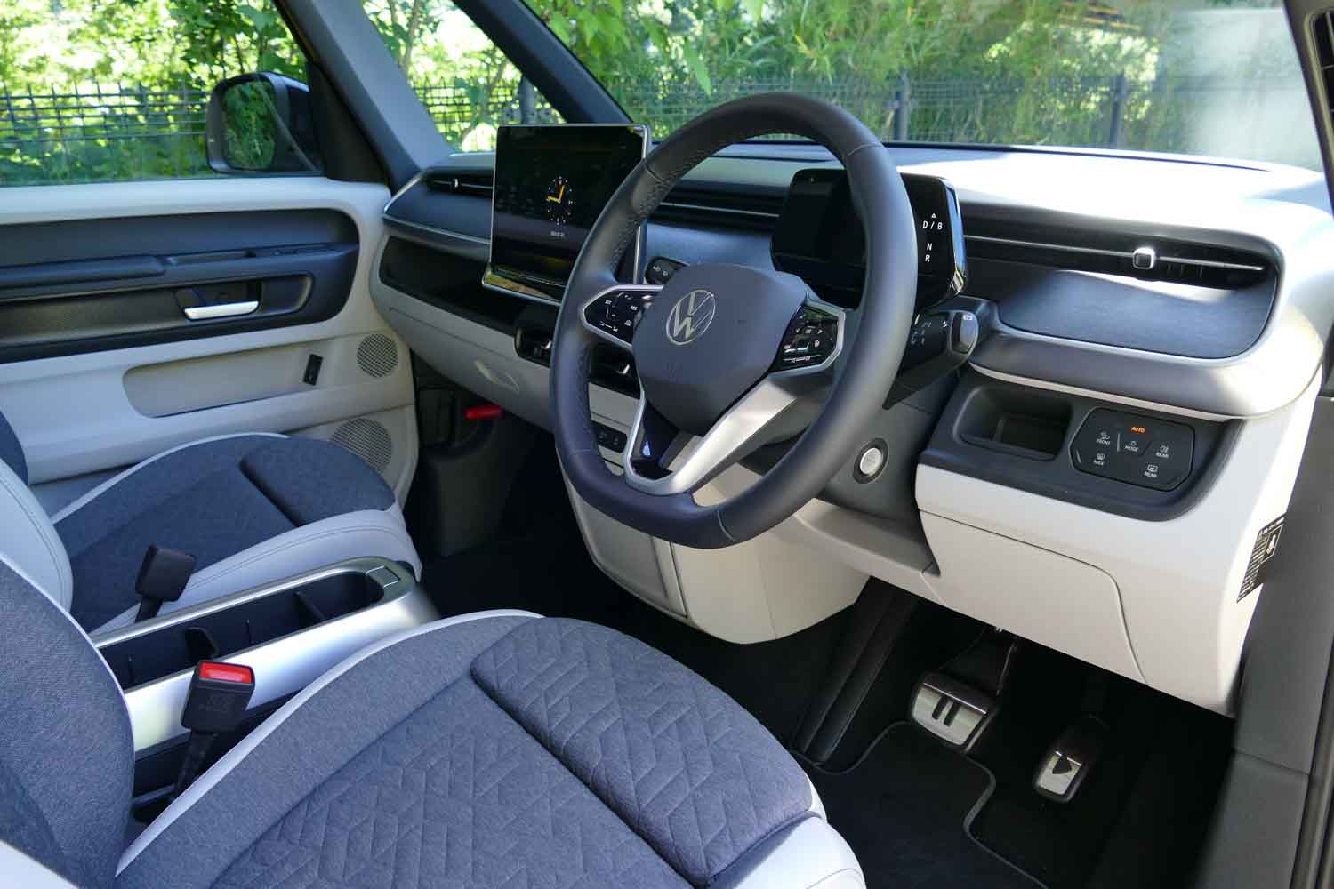 インテリアは上級クラスの国産ミニバンとはひと味もふた味も違う。フロアがフラットで、調光式パノラマガラスルーフは透明にも曇りガラス風にもできて便利。インテリアトリム類のデザインそのものもシンプルでクリーンなため、そんな空間で過ごすとじつに清々とした気持ちが味わえる。ロングはセカンドシートのスペースが明らかに広く、サードシートは窮屈感とはまったく無縁……といったところ。