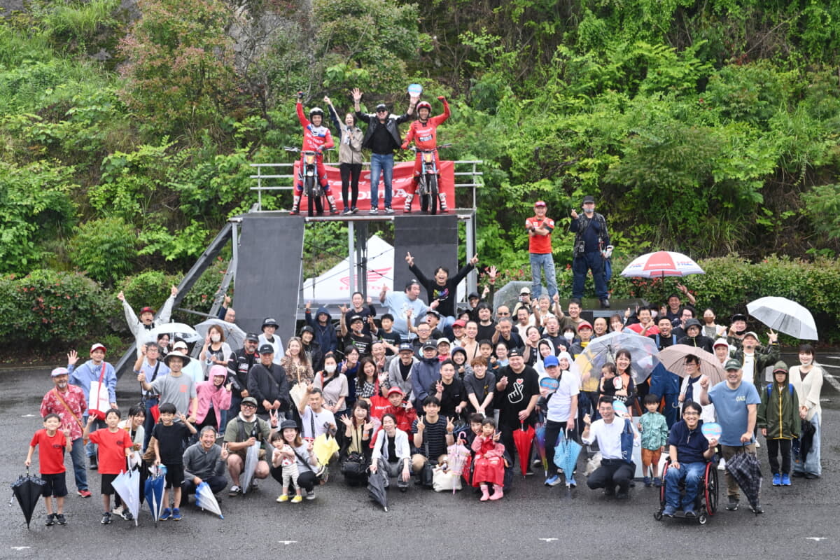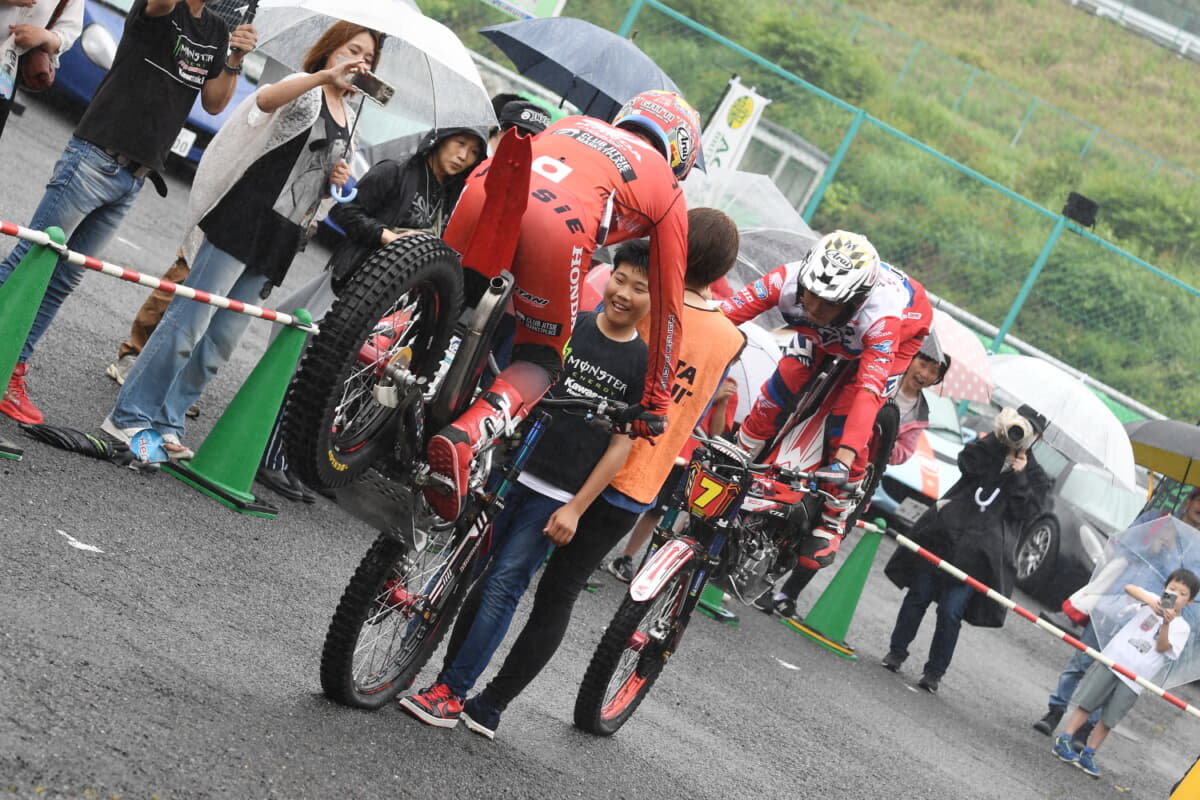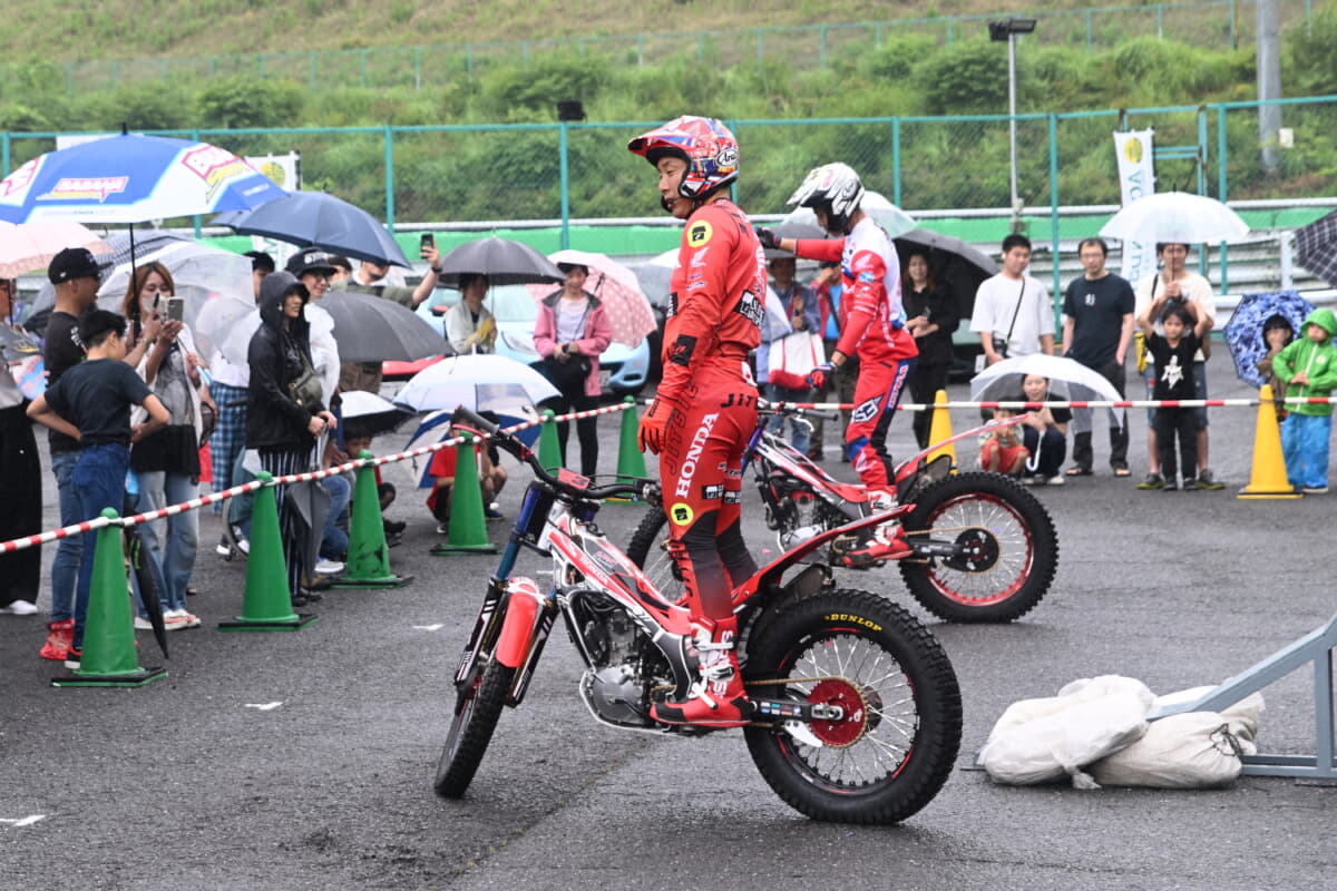 全日本トライアル選手権・国際A級スーパー(IAS)クラスで12年連続、通算14回のチャンピオンに輝く小川友幸選手と、2023年スペイン選手権で7位、現在は国内IASクラスに挑戦中の武田呼人選手の2名が登場。大雨のなかで、迫力のトライアルデモンストレーションを披露しました。
