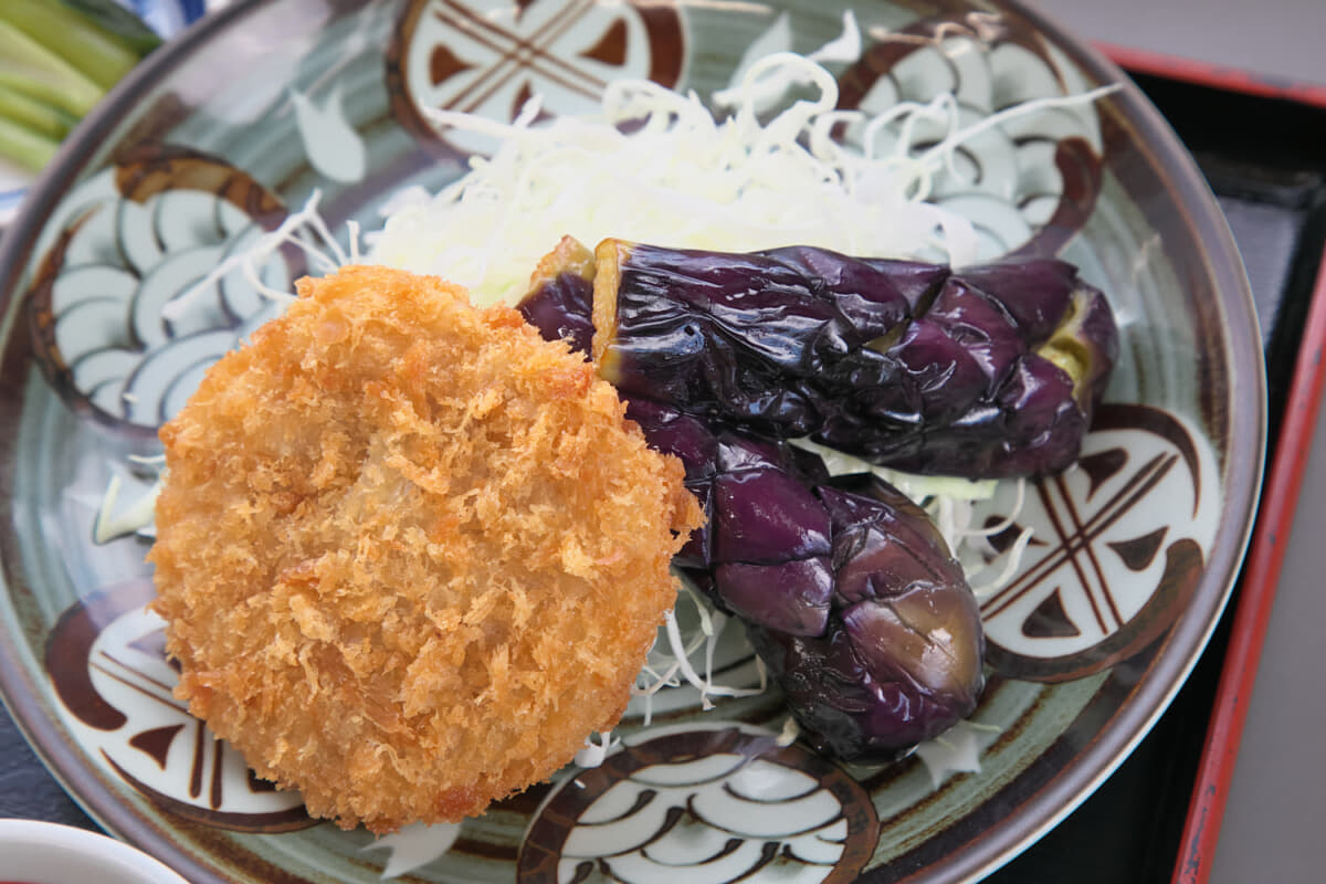 一期一会を信じる筆者は迷わず小黒川定食をチョイスした。揚げたてのメンチカツも惹かれるが、艶々に輝く揚げなすの新鮮さは写真からでも伝わりそうなほど。揚げなすを鬼おろしに付けて食べると、ご飯が止まらないほどオイシイ。