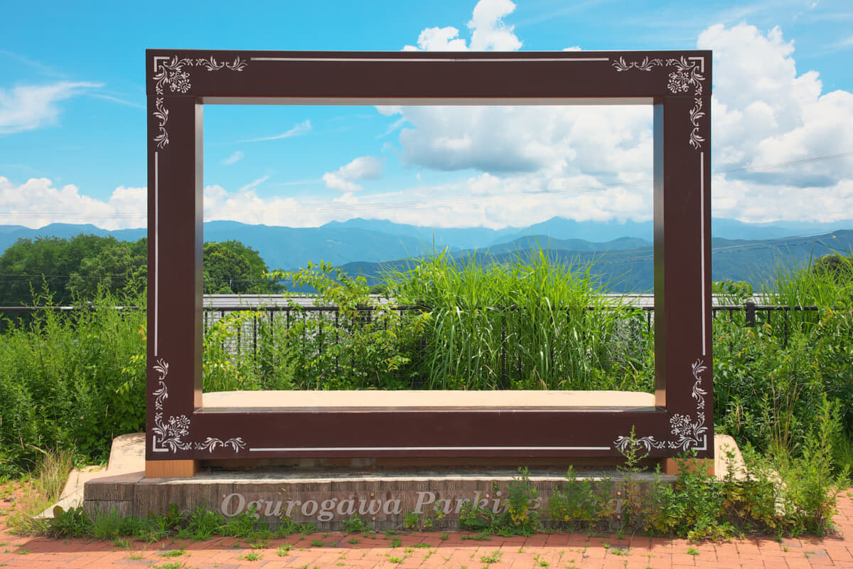• 南アルプス山脈をバックにフレーム付き記念写真を撮影できる
