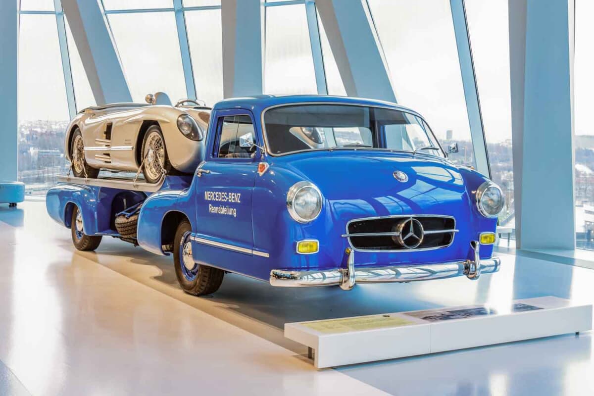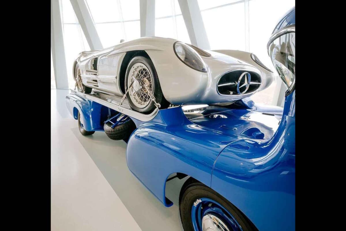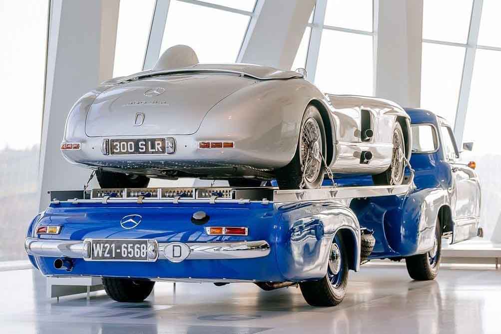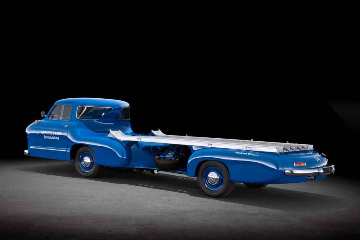 第二次世界大戦後、レースから遠ざかっていたメルセデス・ベンツは、1954年のF1に挑戦することを決めました。エンジンの開発コードナンバーW196。このユニットは通称「300SLR」と呼ばれるスポーツカー選手権用のマシンW196Sにも搭載されました。それと同時に1955年のモータースポーツシーズン用の高速レーシングカー・トランスポーターをワンオフで製造したのです。その名前は「ブルーワンダー」。じつはこの高速レーシングカー・トランスポーターには、初めてガルウィングドアを採用した300SL(W198型)と同じ3L直6エンジンが搭載されていたのです。