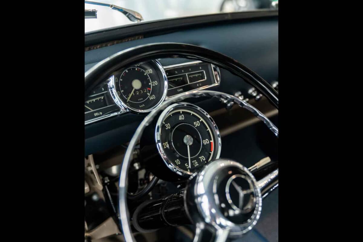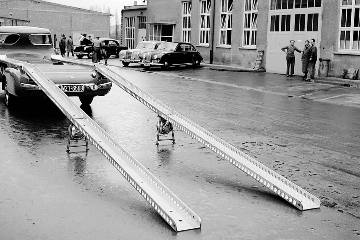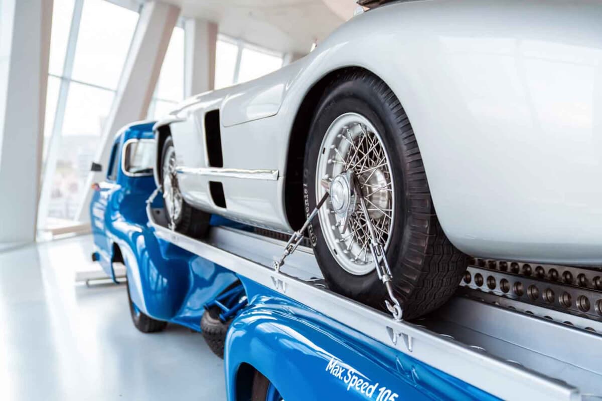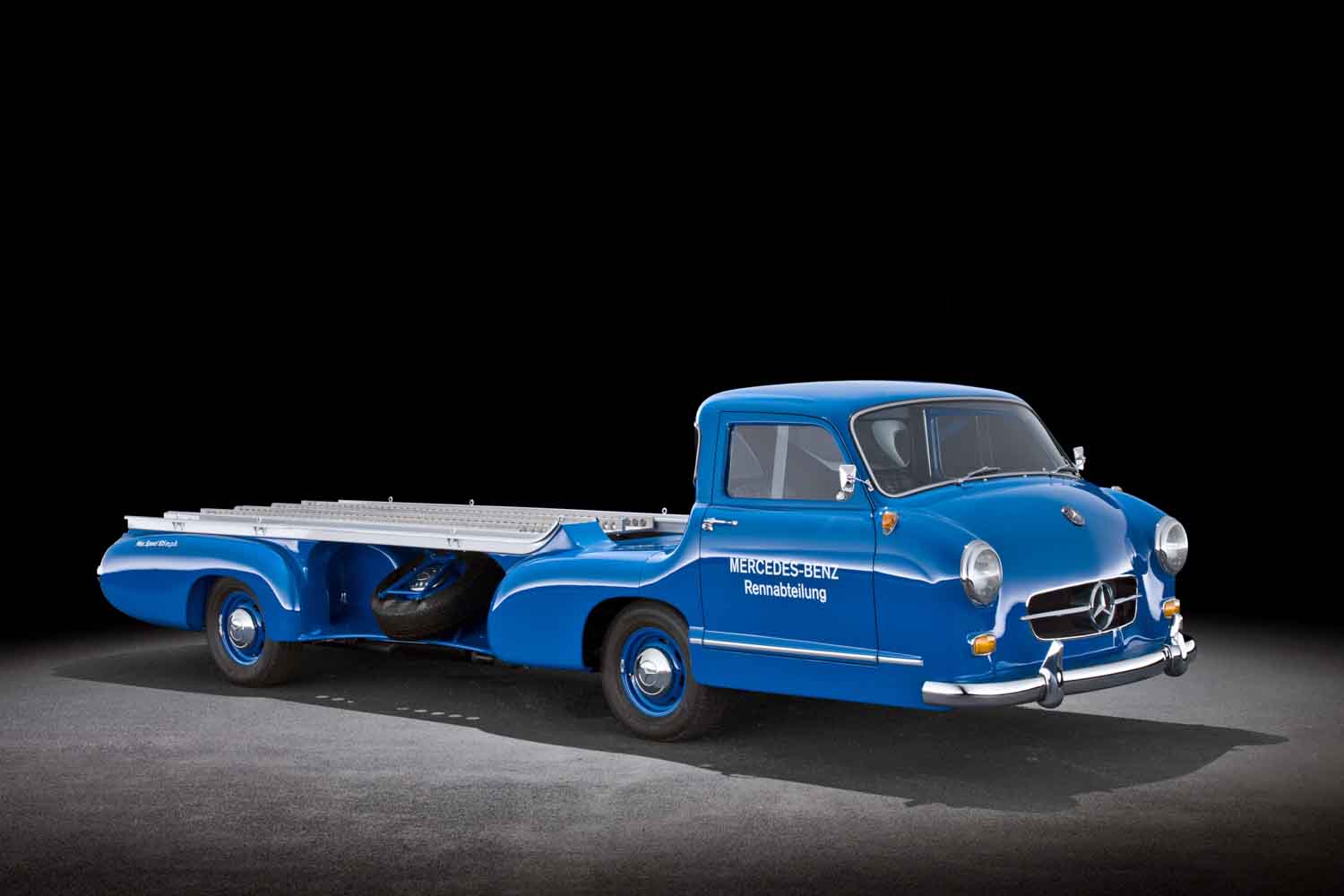 第二次世界大戦後、レースから遠ざかっていたメルセデス・ベンツは、1954年のF1に挑戦することを決めました。エンジンの開発コードナンバーW196。このユニットは通称「300SLR」と呼ばれるスポーツカー選手権用のマシンW196Sにも搭載されました。それと同時に1955年のモータースポーツシーズン用の高速レーシングカー・トランスポーターをワンオフで製造したのです。その名前は「ブルーワンダー」。じつはこの高速レーシングカー・トランスポーターには、初めてガルウィングドアを採用した300SL(W198型)と同じ3L直6エンジンが搭載されていたのです。