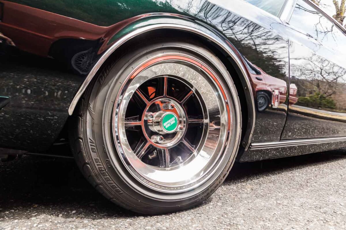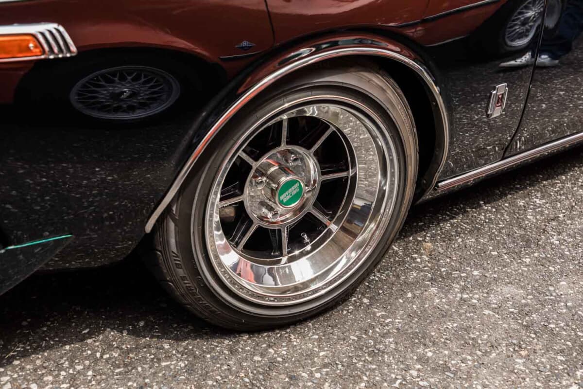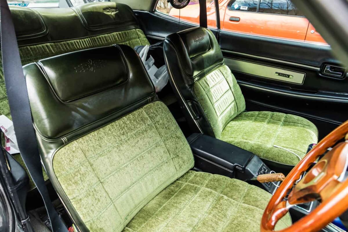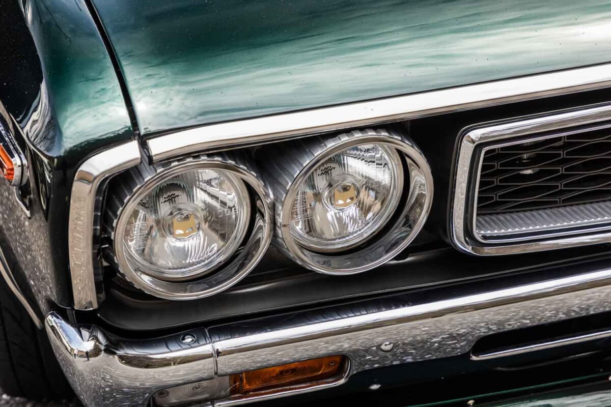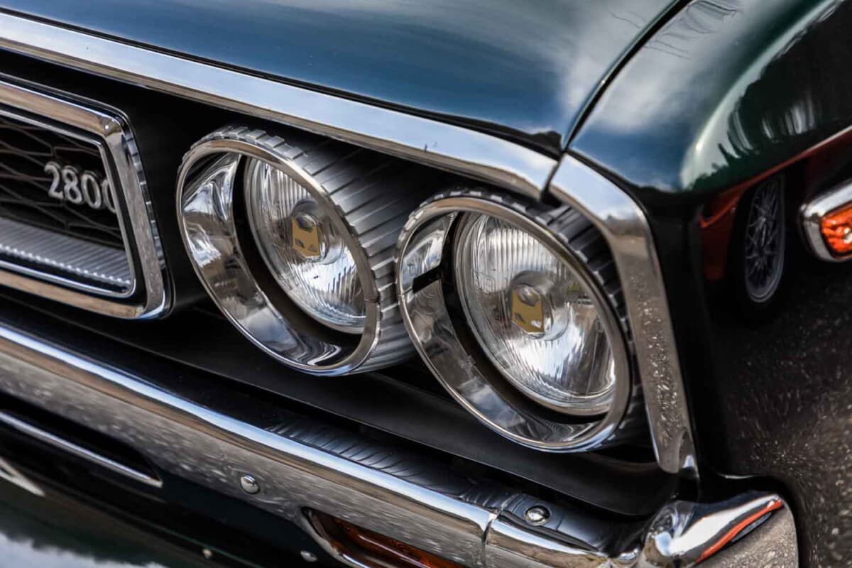 一般的にブタケツローレルのカスタムといえば、オーバーフェンダーにノーサス仕様というイメージが強い。しかし斎藤さんのローレルは、マツダ・デミオのグリーンにペイントされたボディにクロームのフェンダーアーチモールが残り、各部のエンブレムやバッジ類も揃う、ツウ好みの仕上がりだ。後期型特有のギザギザ形状のヘッドライトベゼルにはマーシャル製ライトを組み込み、グリルには2800のエンブレムを装着するなど、細部にまでこだわりが見える。