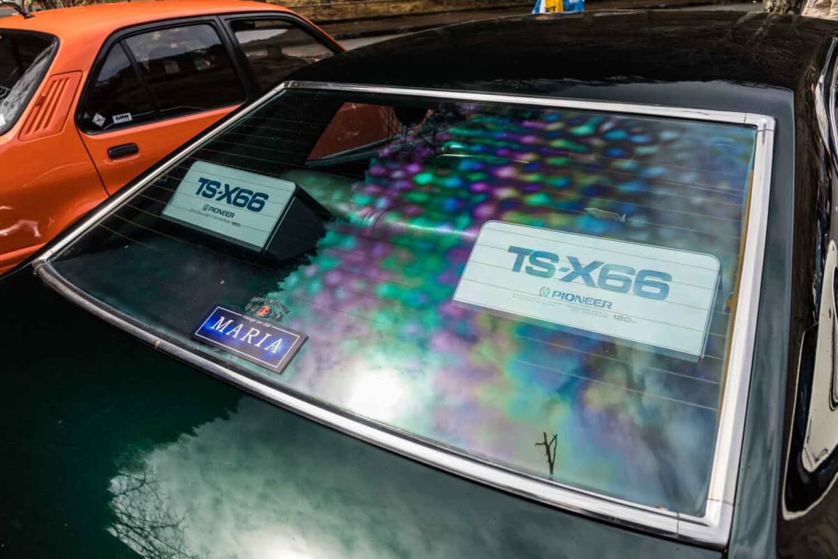 インテリアも新品同様の仕上がりだ。シートはブラックレザーとグリーンファブリックで張り替えられ、SGX用のドアパネルも備わる。ステアリングは懐かしいMOMO製フルウッドで、ローレル購入を知った友人からのプレゼント。シフトノブは水中花で、センターコンソールにはポピーの芳香剤と往年のアイテムが並ぶ。さらにオーディオは純正ラジオ部分にBluetoothユニットを組み込み、リアシート後部にはパイオニア製TS-X66のデッドストックスピーカーを搭載するなど、当時の雰囲気と現代の利便性が融合している。
