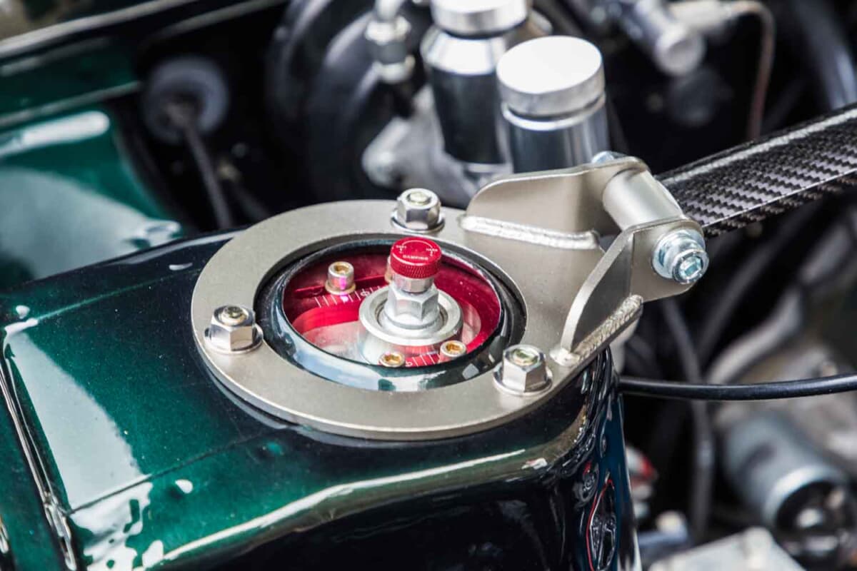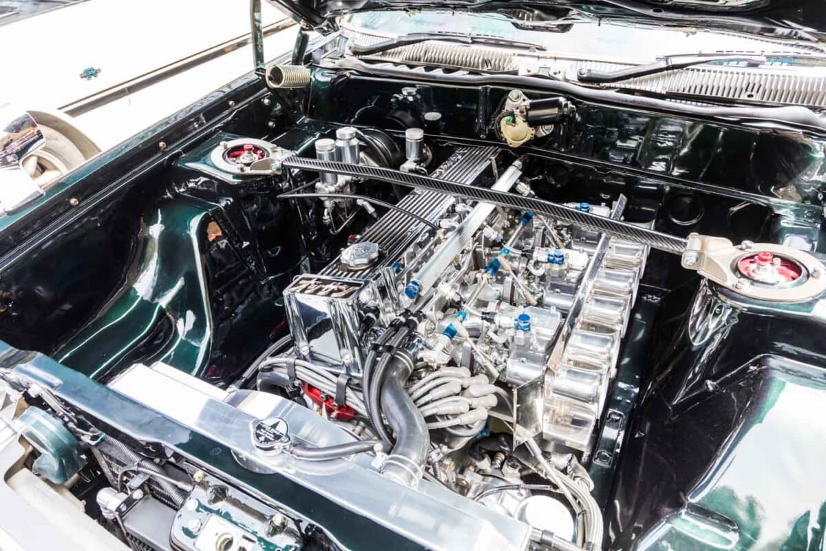 ボンネットを開ければ、エンジンルームもショーカーさながらの輝きを放つ。L28改3Lエンジンには徹底したディテールアップが施され、配線や配管を隠すワイヤータックも実行されている。スターロード製のクーラーが装着されているが、配管をフェンダー内に通すなど、見えない部分にも美観への配慮がなされている。