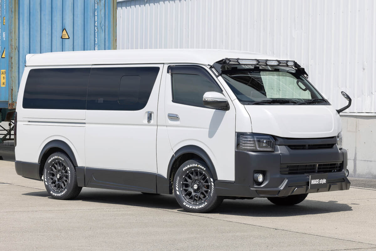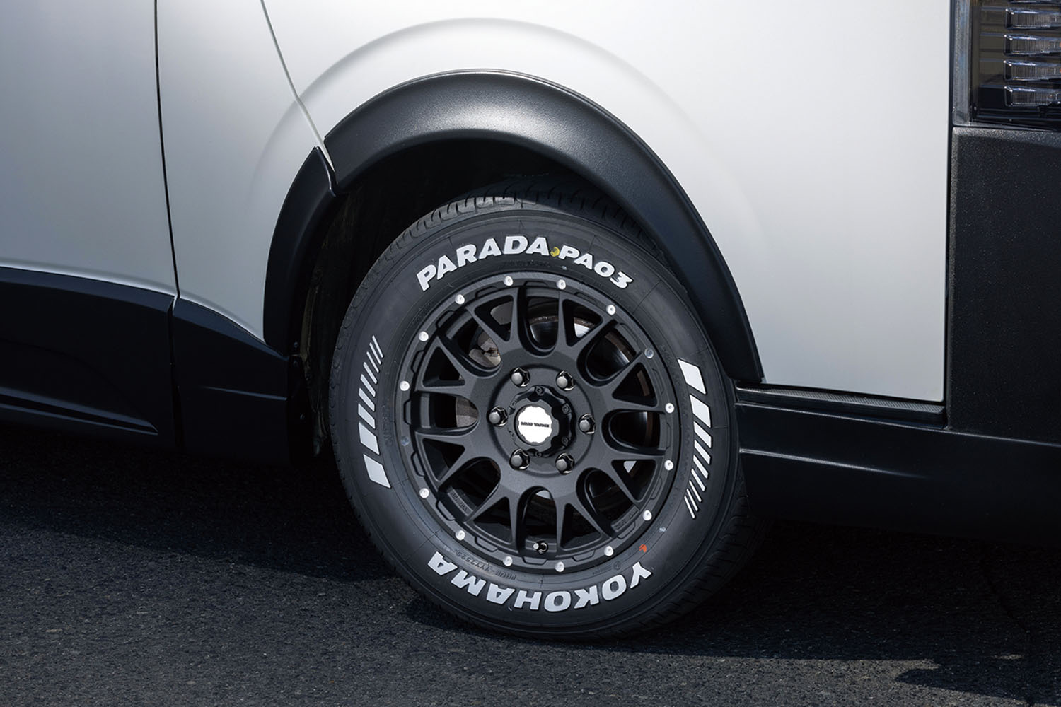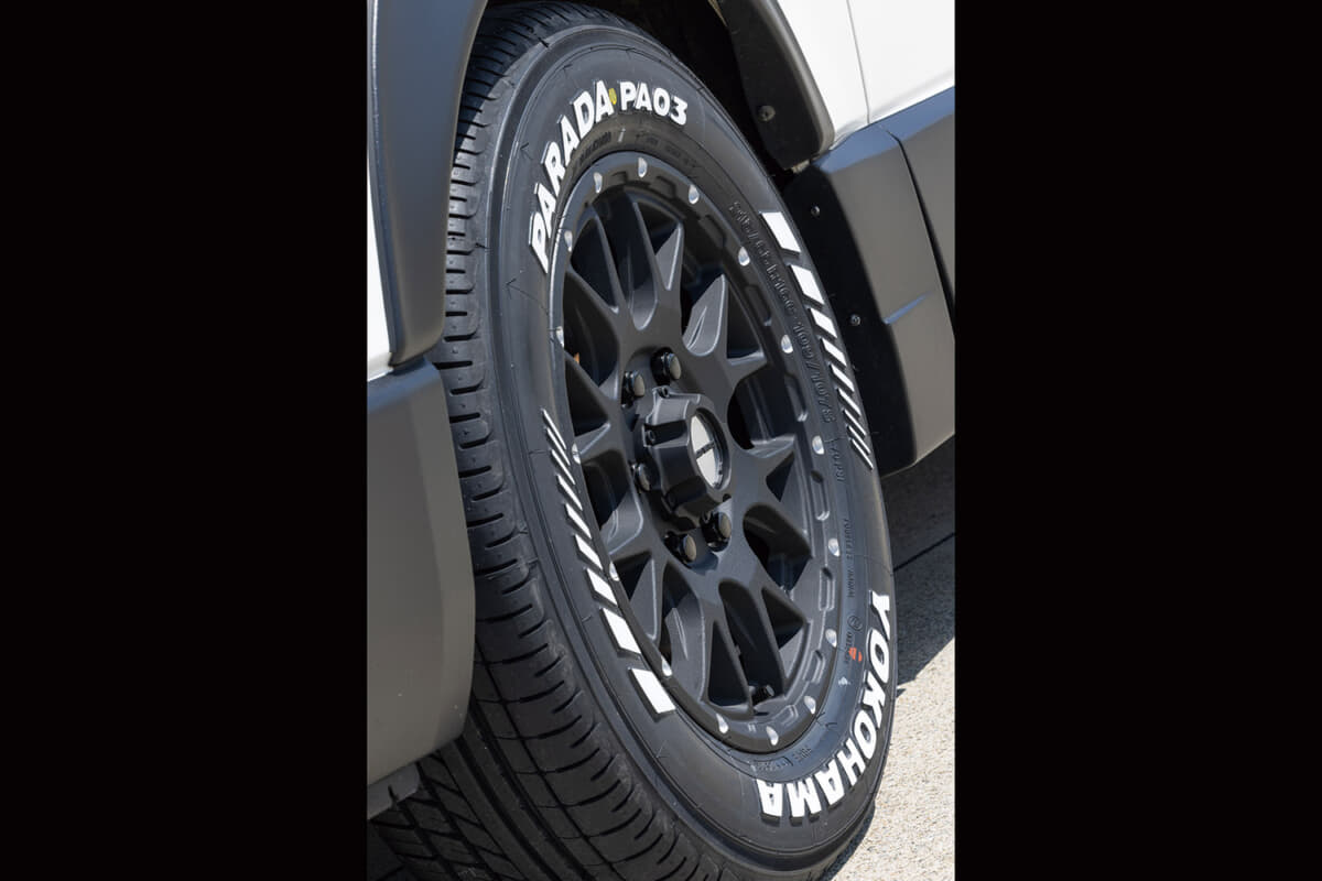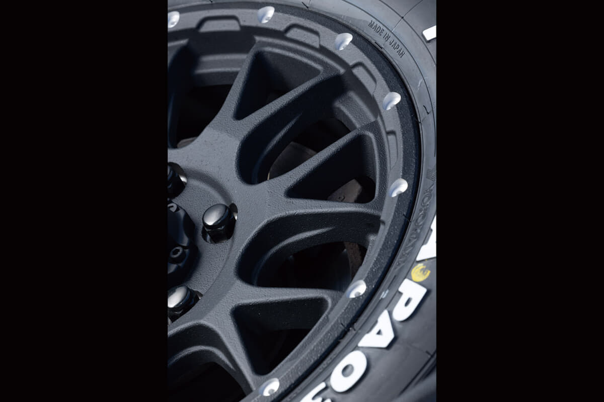 デザインの中核を成すディスクはラフな8交点メッシュが、SUVや4WD系にマッチする力強いオフロードスタイルを演出。ゴツゴツとしたブロックタイヤやホワイトレターとも好相性だ。