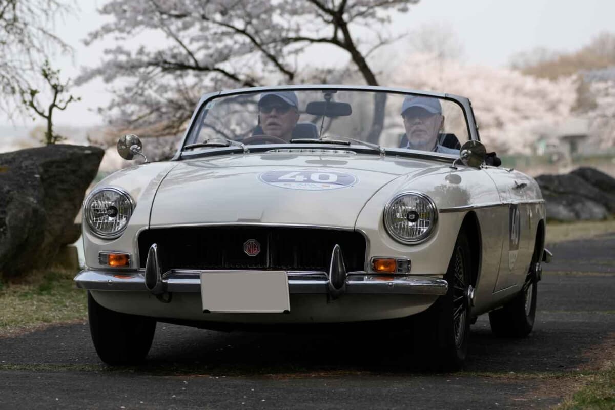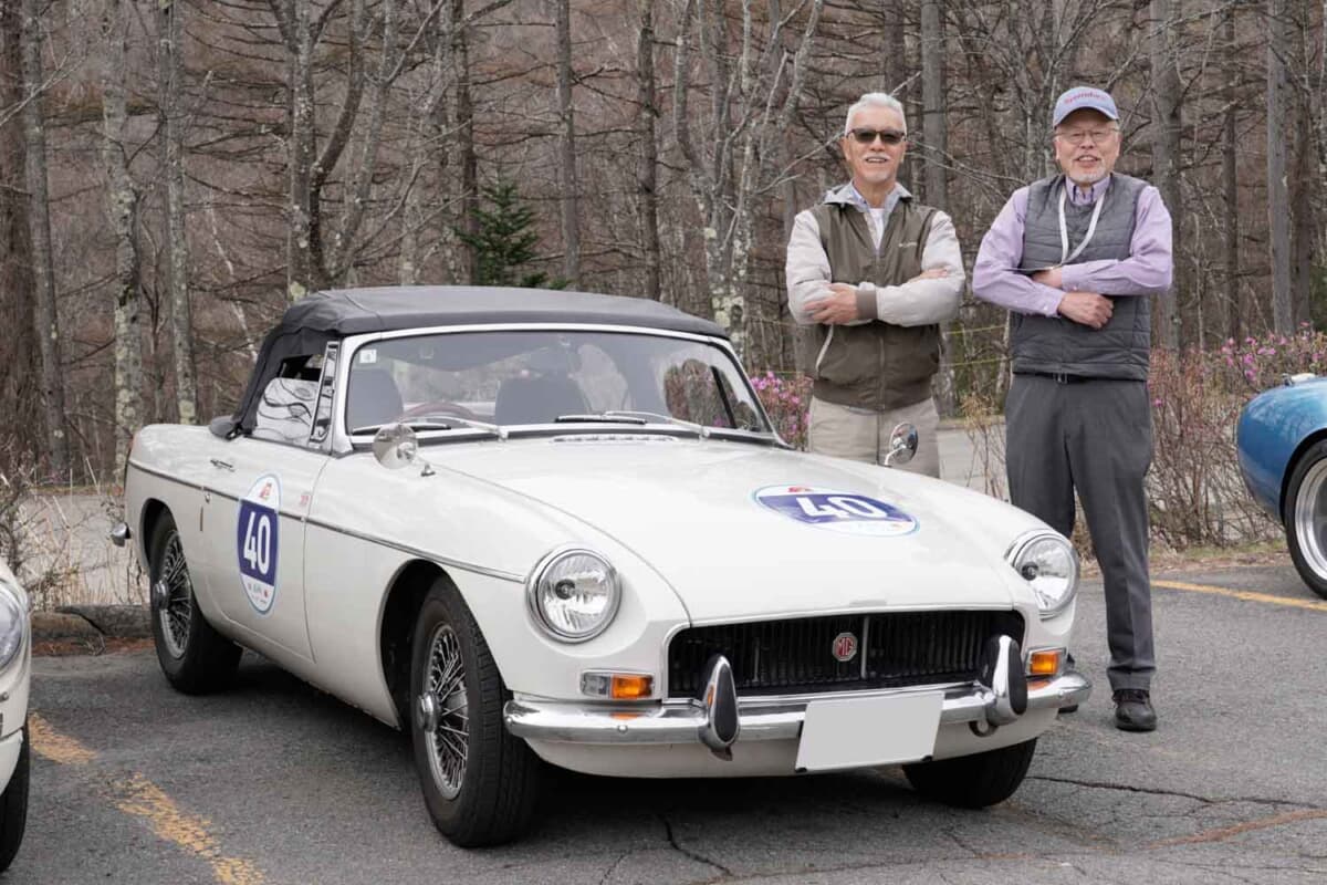 • 大学の自動車部時代からの友人コンビ、小川喜康さんと山田恵一さん。小川さんの愛車、1971年式MG「B」でクラシックカーラリーを楽しむ