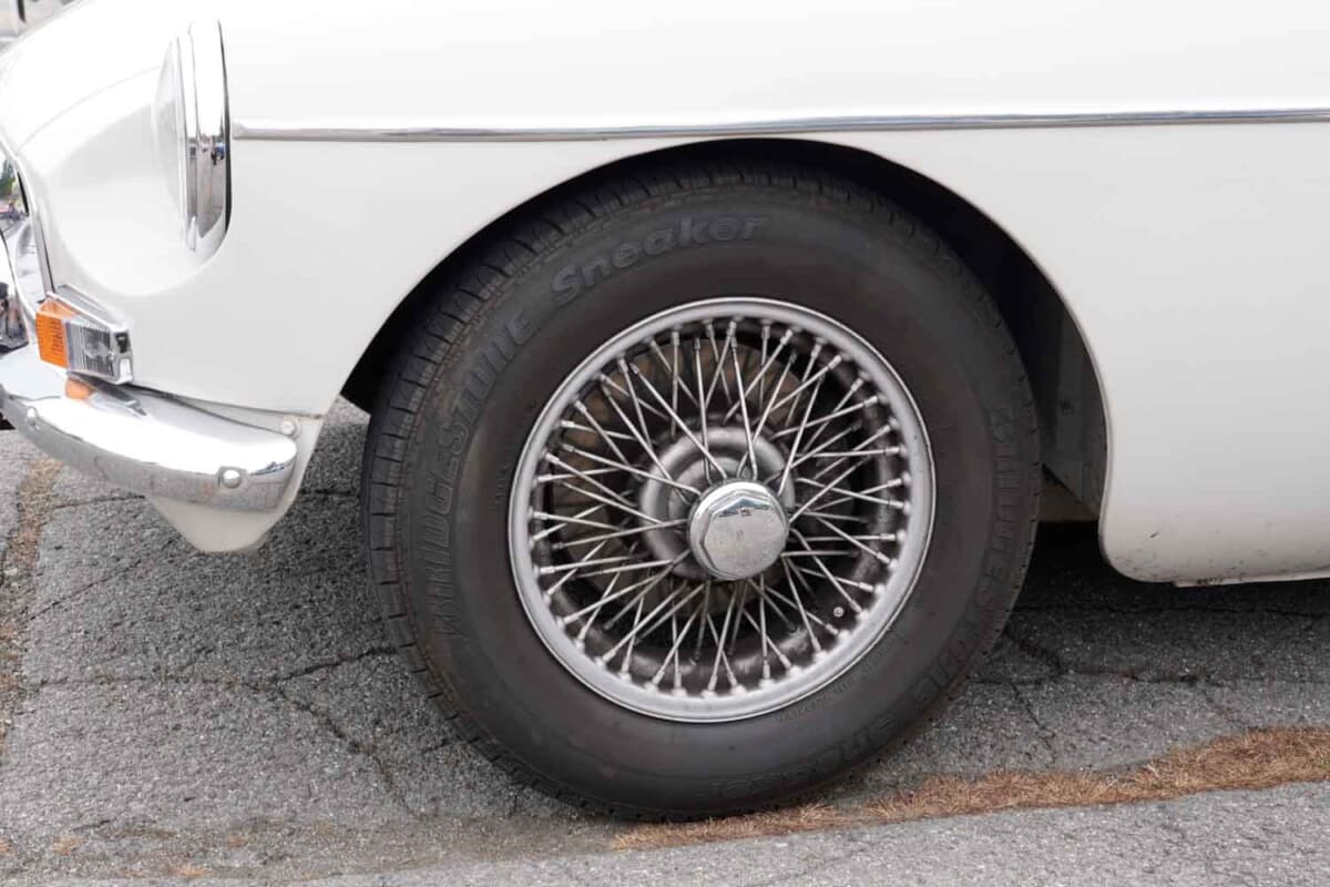 • MG「B」:165/80R14サイズのタイヤとスポークホイールはセンターロック方式。フロントはディスクブレーキを備える