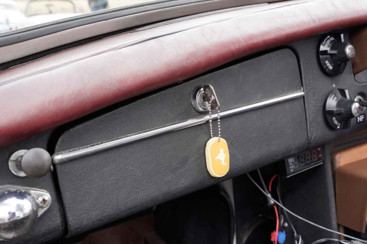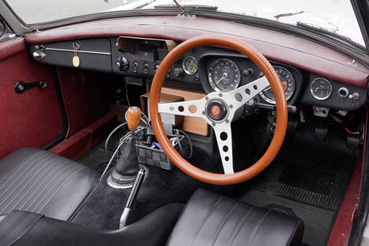 • MG「B」:センター部分には、「線踏み」競技用の計測機器を装備したインパネ。ウッドステアリングはMOMO製「モンツァ」