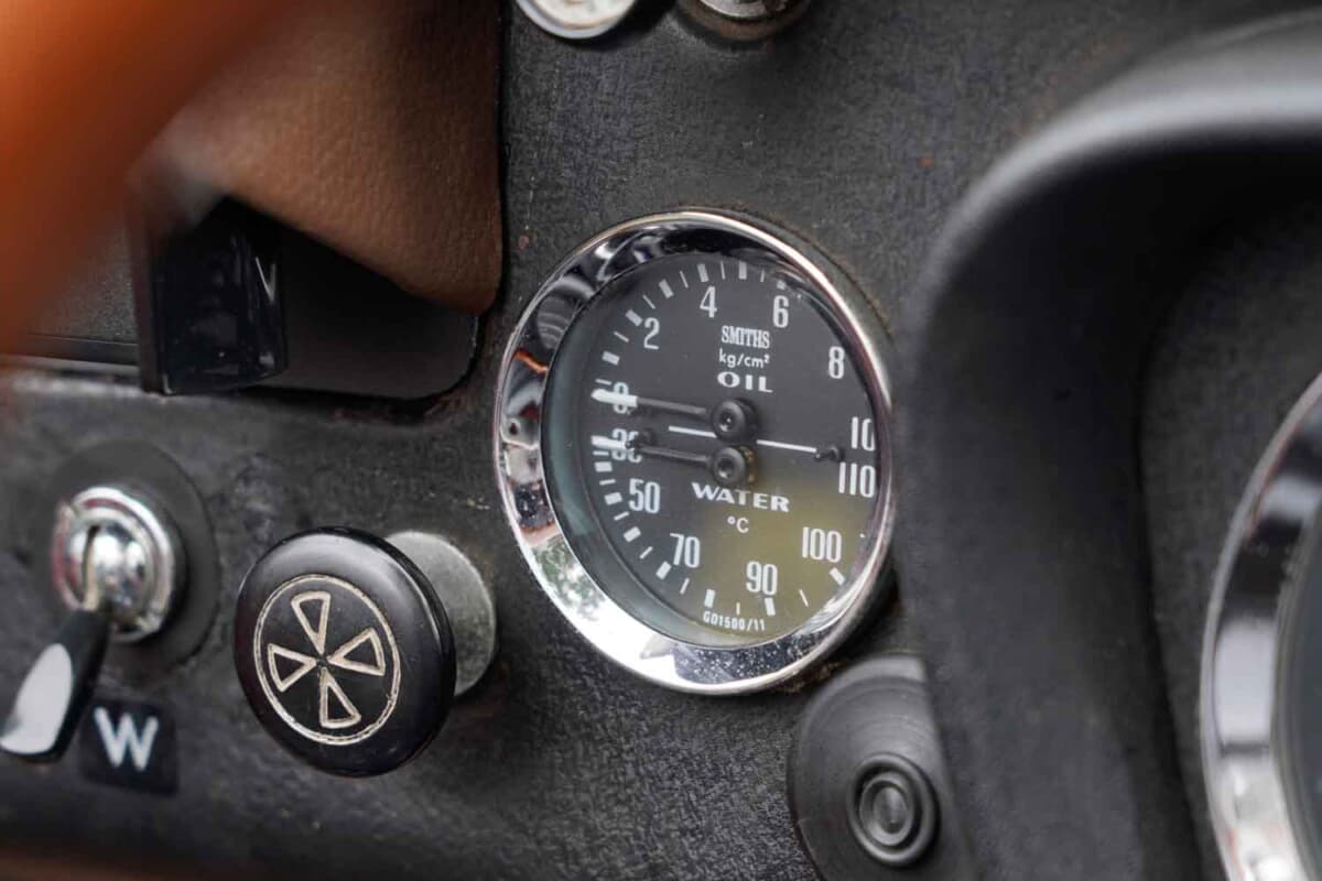 • MG「B」:オイルプレッシャーゲージと水温計はスミス製のデュアルゲージ。購入時は油圧がなく針が動かなかったが、現在はエンジンをオーバーホールして完調となり、しっかりと油圧がかかる