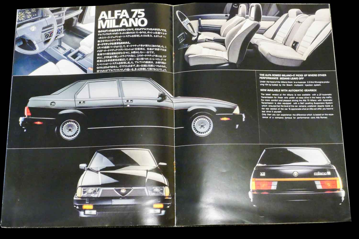 一方で、日本仕様のカタログには2Lのツインスパークと2.5LのV6が用意されていた。燃料供給装置は、ツインスパークがM.M.E.I(モトロニック・マルチポイント・エレクトロニック・インジェクション)、V6がB.L.J(ボッシュ・Lジェトロニック)である。カタログの諸元表によると、いずれも最高速度205km/h、V6を搭載した「75 MILANO」では1/4マイル加速タイムが17.5秒と記されていた。