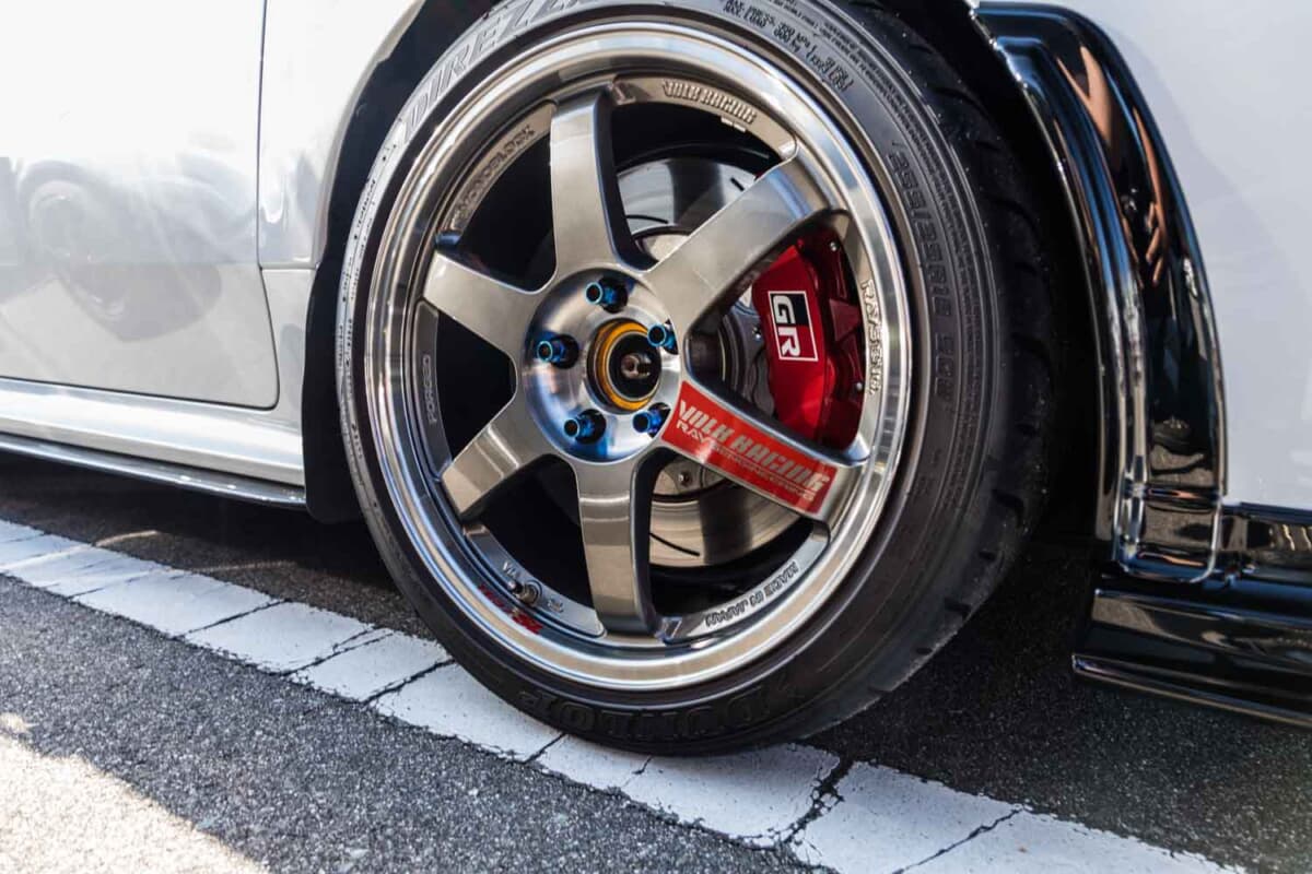 • トヨタ GRヤリス:ホイールはRAYSボルクレーシングTE37 SLで、サイズは18×9J+45。これに255/35R18サイズの「ディレッツァZIII」を組み合わせ、20mmのスペーサーを使って、フェンダーラインぎりぎりにセット