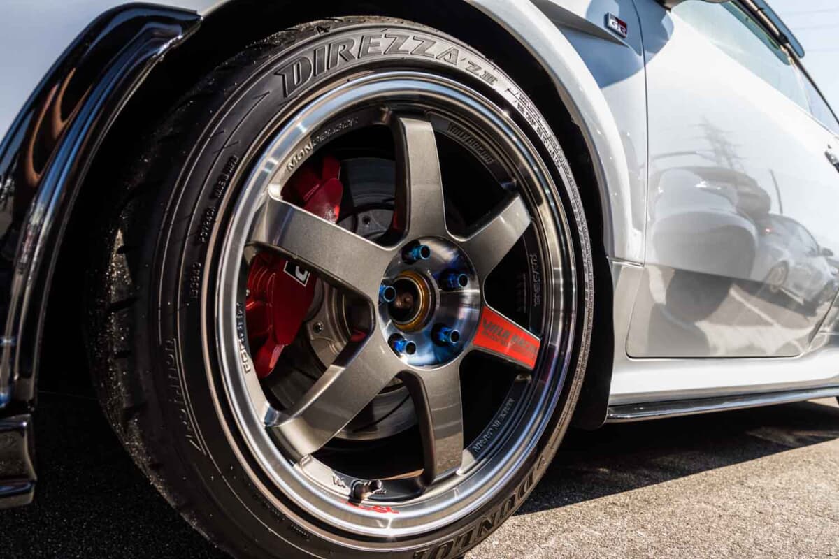 足まわりはHKS製の車高調を装着してかなり低いスタンスに。ホイールはRAYS「ボルクレーシングTE37 SL」でサイズは18×9J+45。これに255/35R18サイズの「ディレッツァZIII」を組み合わせ、20mmスペーサーを使ってフェンダーラインぎりぎりにセット。迫力あるスタンスを実現しているのです。