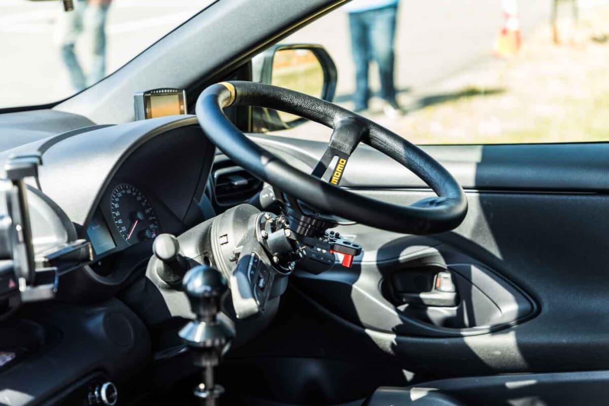 • トヨタ GRヤリス:ステアリングはMOMOのMod.08で、ワークスベルRAPFIX GTCを併用することで、乗降時はステアリングを跳ね上げられるようにしている